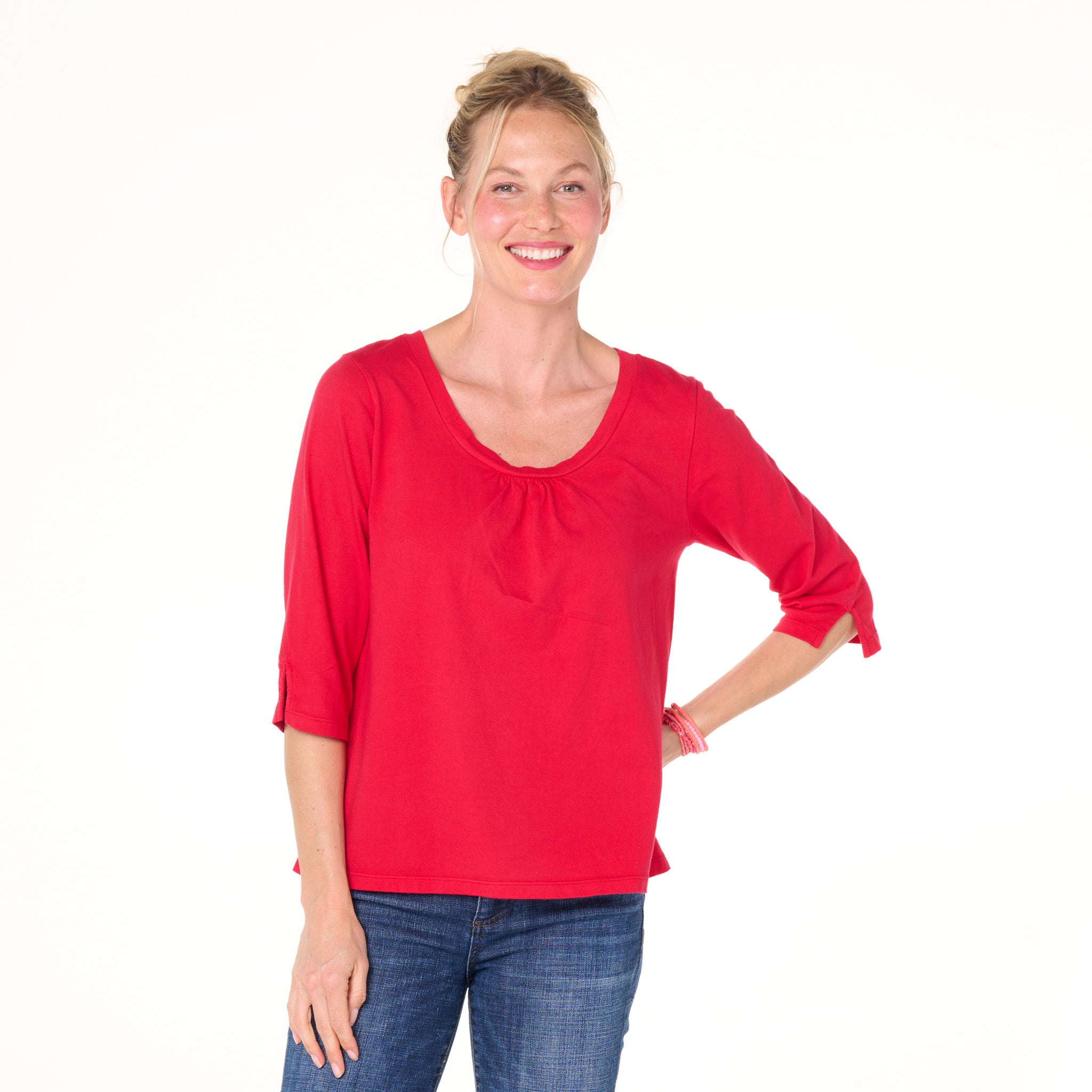 The 3/4 sleeve Beach Front T is anything but ordinary. Easy scoop neck with ruching for added embellishment and a roomier fit that skims the body for a flattering look. The length of the sleeve hits below the elbow and has a slit onside for function and style. Length 23 3/4" in size MD. Preshrunk. Machine wash cold, tumble dry low. 100% soft cotton jersey. Made in the USA. Model is 5'8" and wears a size small.