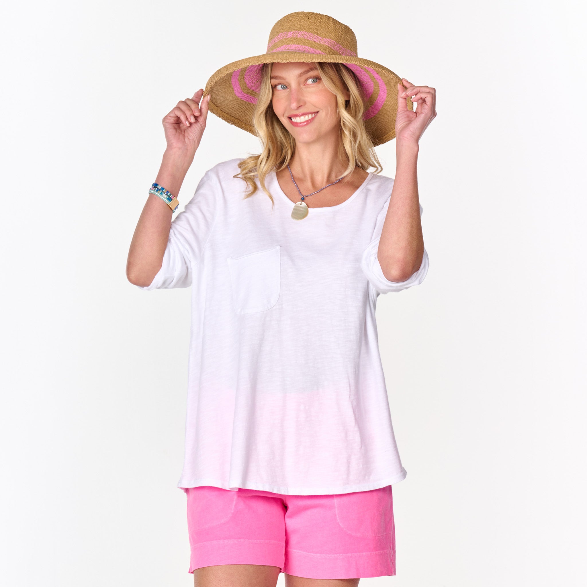 Effortless style of the One Size Forever top features a chic scoop-neck line, roomy drape fit, 3/4 sleeves, with an oversized raw edge chest pocket for a unique touch. These are the kind of tees everyone needs. Length 26" and width 47" in this one size top. Preshrunk. Machine wash cold, tumble dry low. 100% mid-weight cotton slub. Made in the USA. Model is 5'8".