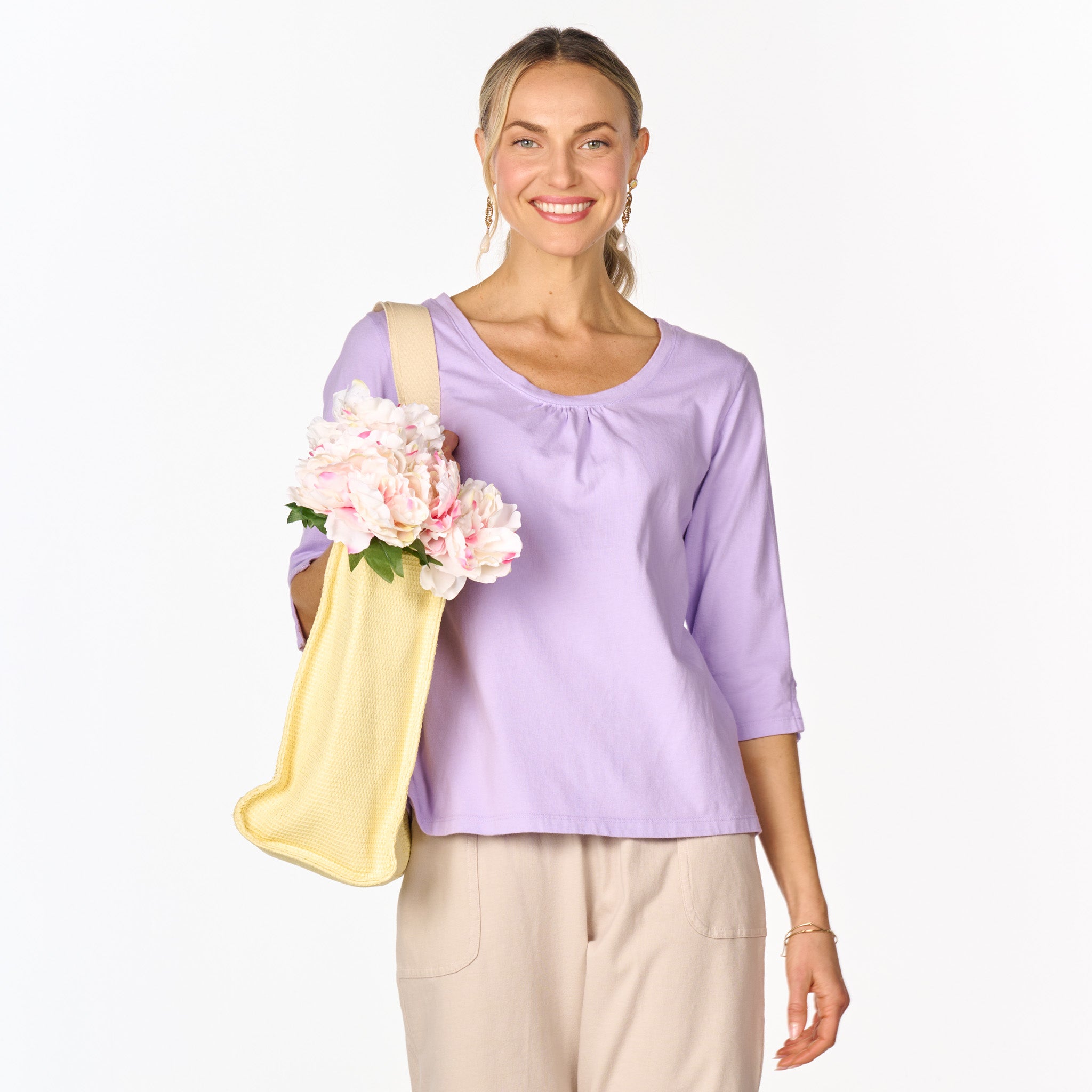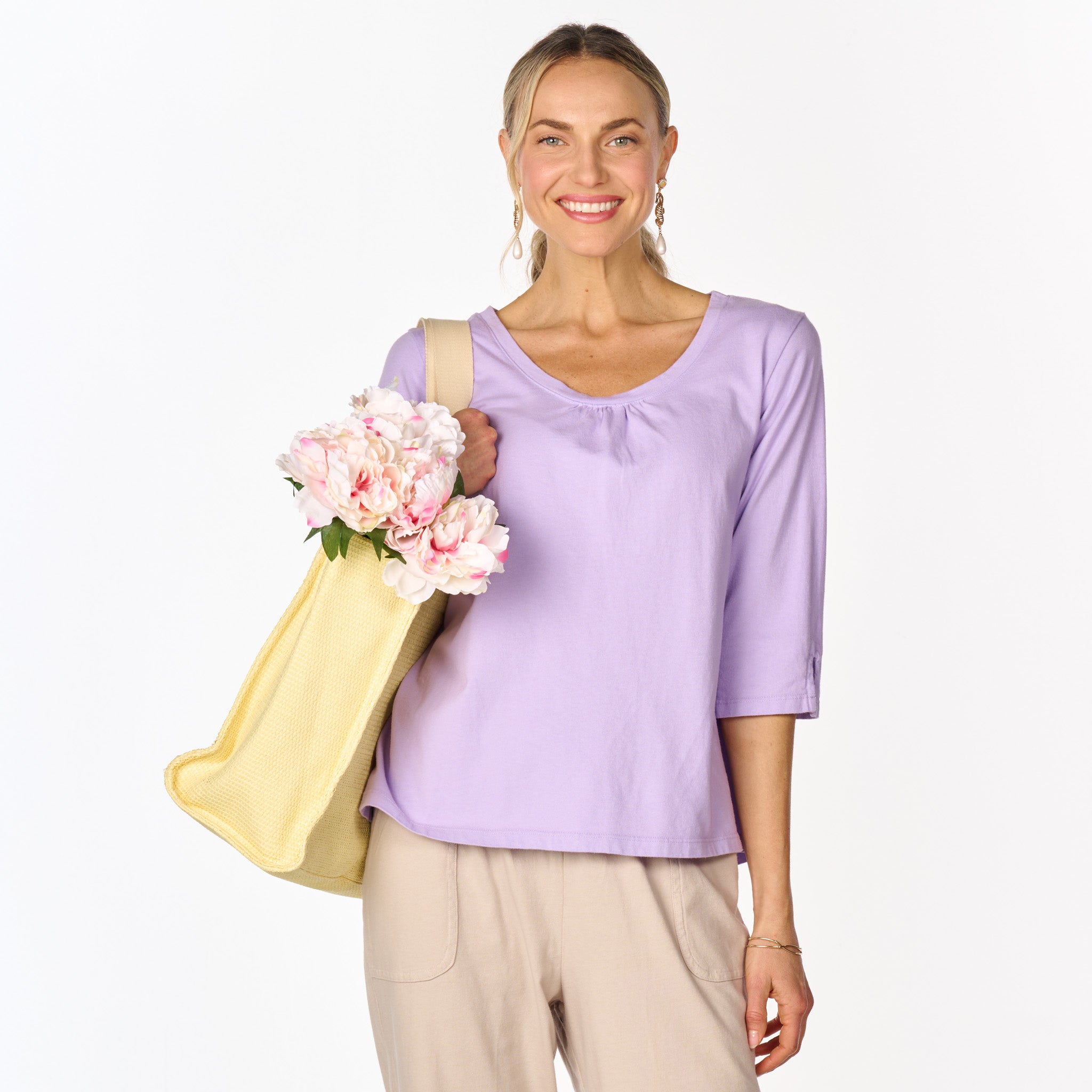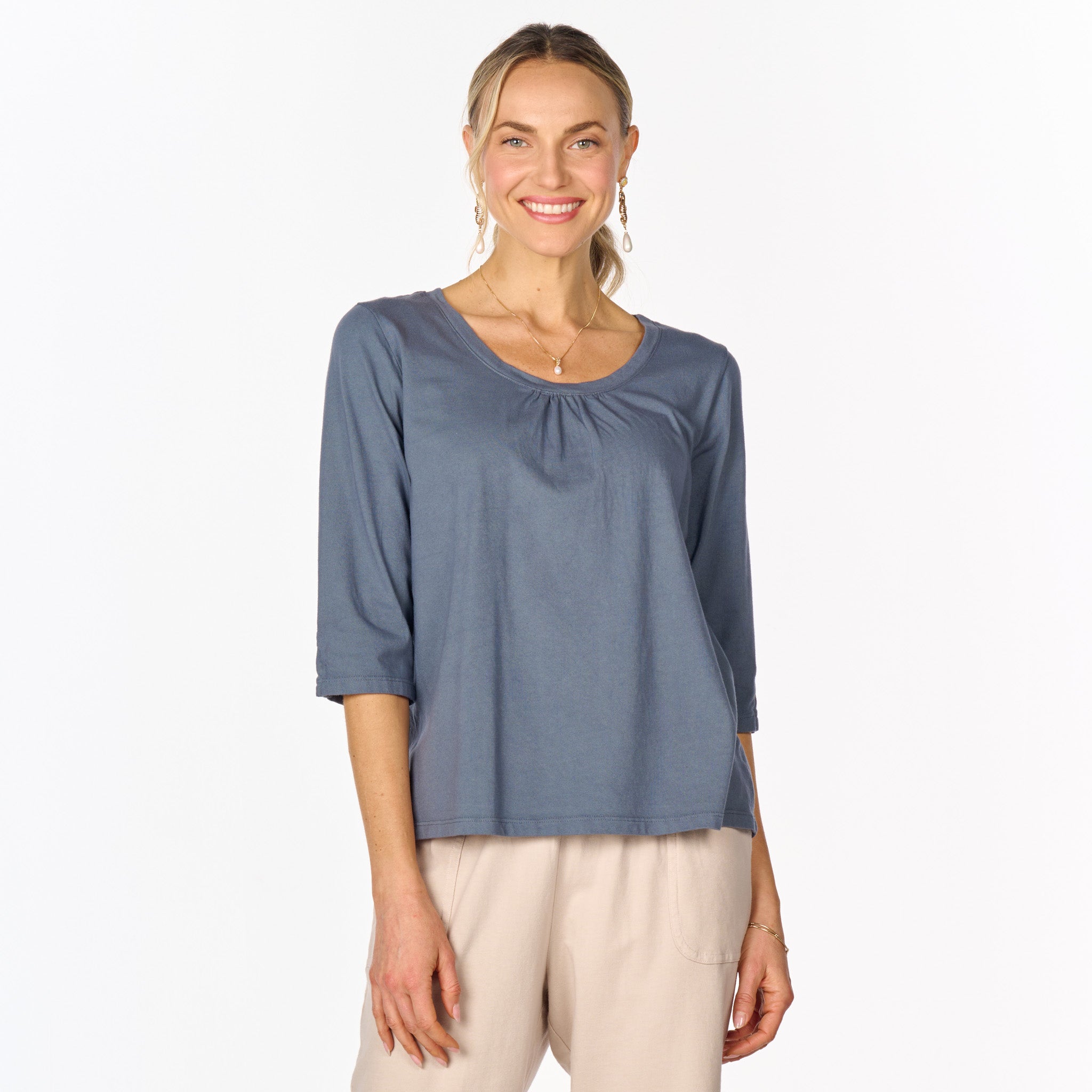 The 3/4 sleeve Beach Front T is anything but ordinary. Easy scoop neck with ruching for added embellishment and a roomier fit that skims the body for a flattering look. The length of the sleeve hits below the elbow and has a slit onside for function and style. Length 23 3/4" in size MD. Preshrunk. Machine wash cold, tumble dry low. 100% soft cotton jersey. Made in the USA. Model is 5'8" and wears a size small.