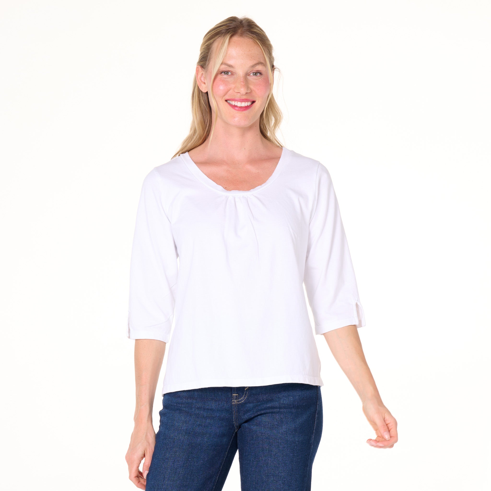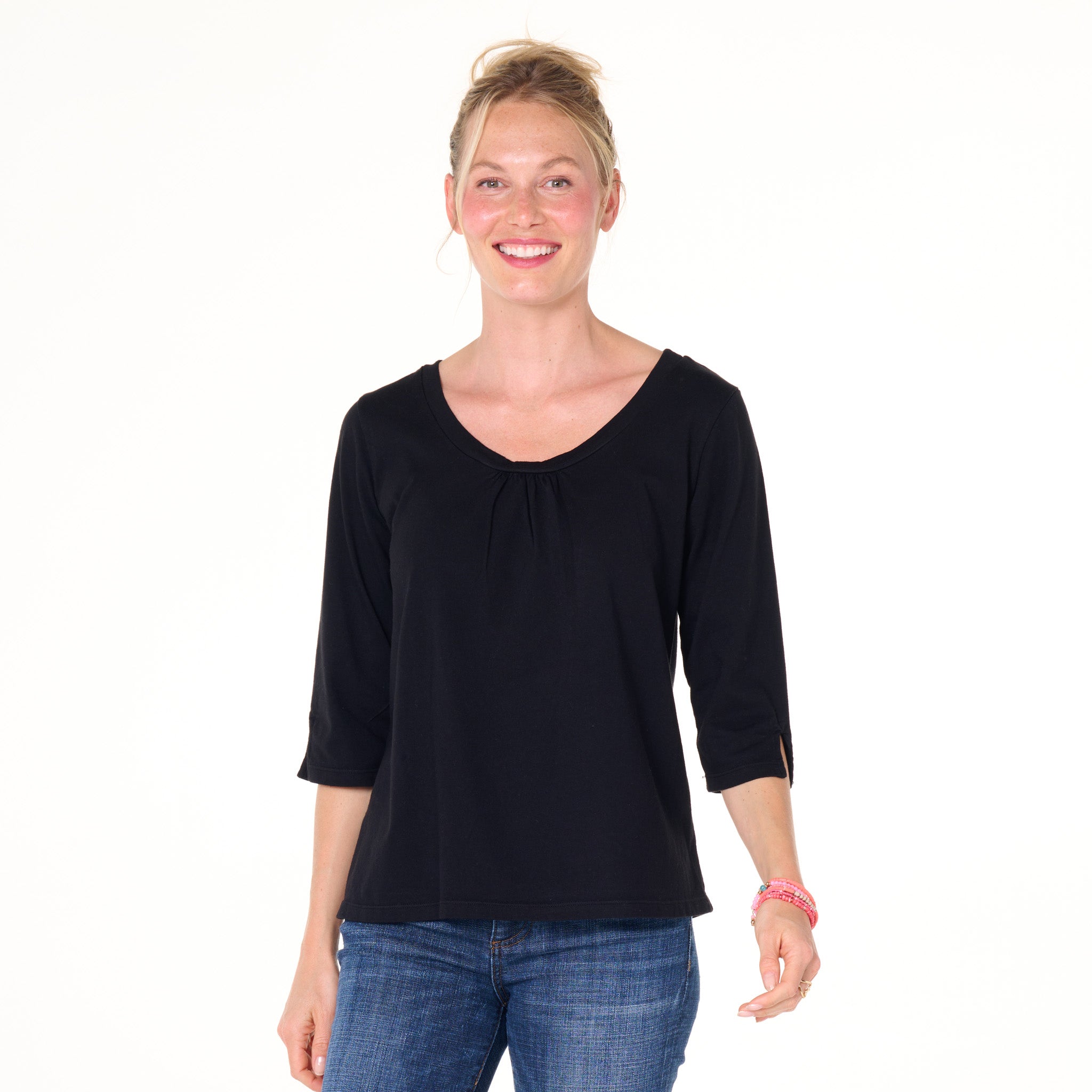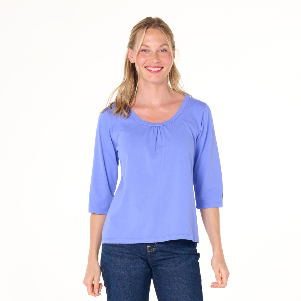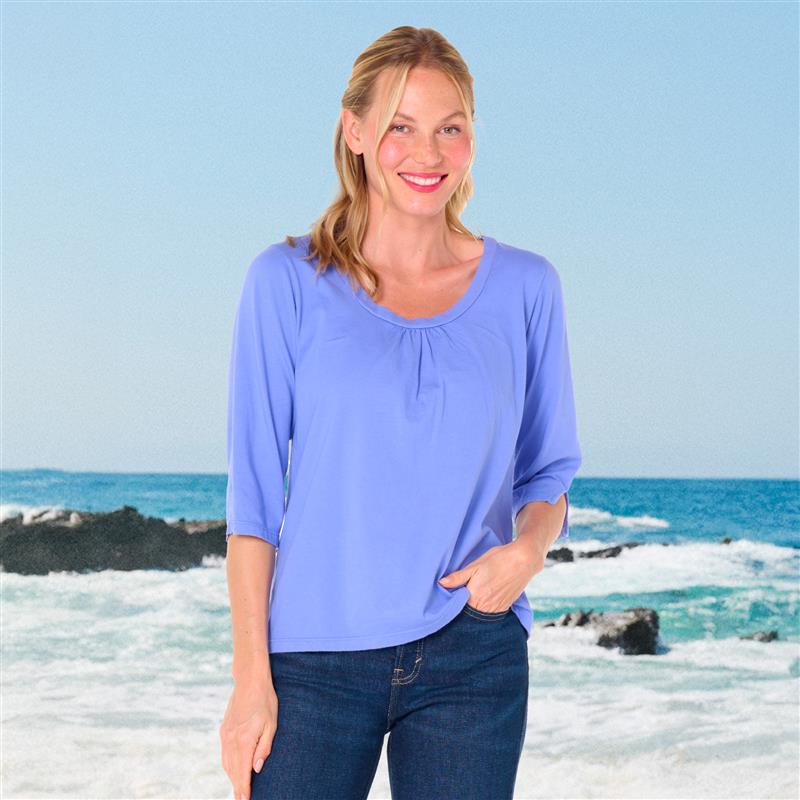 The 3/4 sleeve Beach Front T is anything but ordinary.   Easy scoop neck with ruching for added embellishment and a roomier fit that skims the body for a flattering look. The length of the sleeve hits below the elbow and has a slit onside for function and style.   Length 23 3/4" in size MD. Preshrunk. Machine wash cold, tumble dry low. 100% soft cotton jersey. Made in the USA. Model is 5'8" and wears a size small.