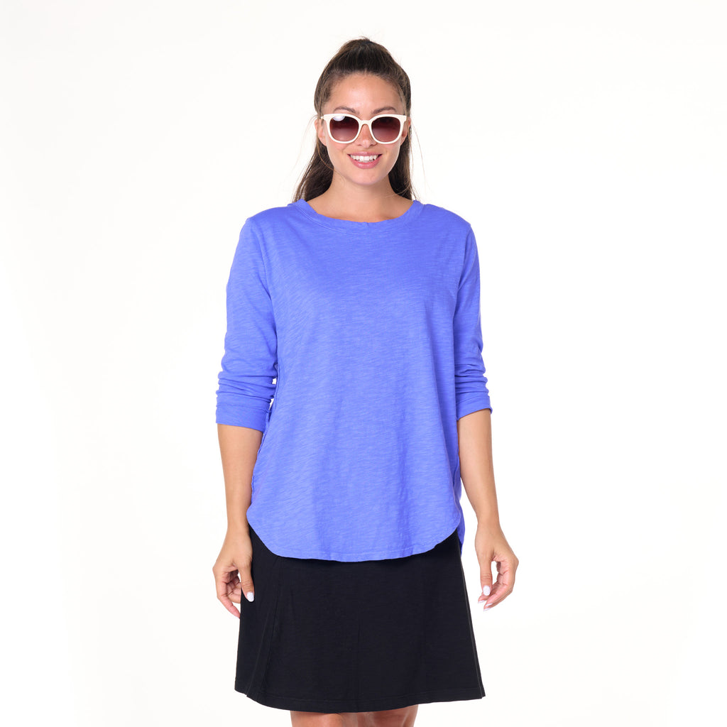 There's no such thing as having too many go-to basics! Our bestselling Catalina Top features a 3/4 sleeve body with overlapping side seams and a curved hemline. Dropped shoulder. Shallow scoop neckline with self trim. Length 25 3/4" length in size MD. Preshrunk. Machine wash cold, tumble dry low. 100% mid-weight cotton slub. Made in the USA. Model is 5'8" and wears a size small.