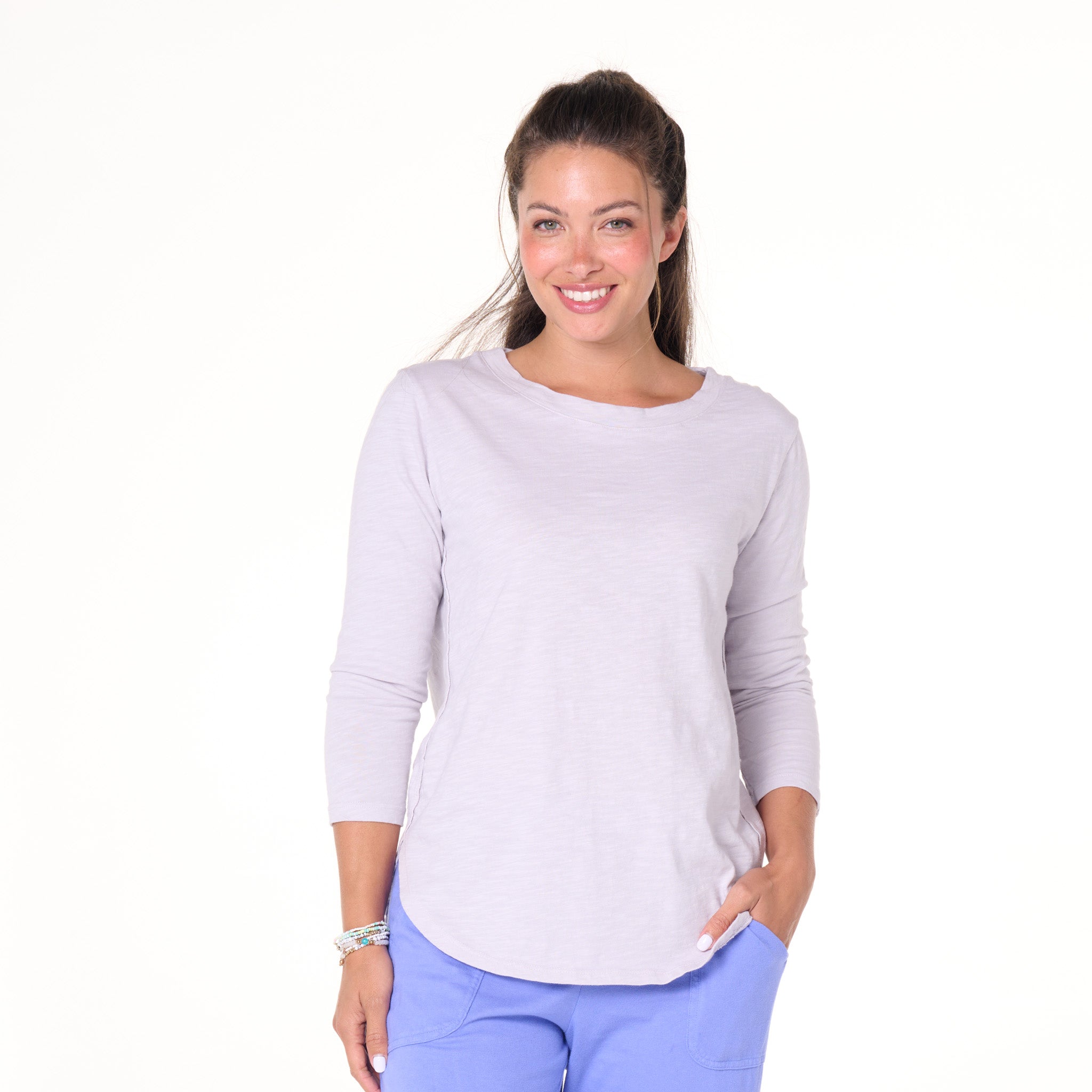 There's no such thing as having too many go-to basics! Our bestselling Catalina Top features a 3/4 sleeve body with overlapping side seams and a curved hemline. Dropped shoulder. Shallow scoop neckline with self trim. Length 25 3/4" length in size MD. Preshrunk. Machine wash cold, tumble dry low. 100% mid-weight cotton slub. Made in the USA. Model is 5'8" and wears a size small.
