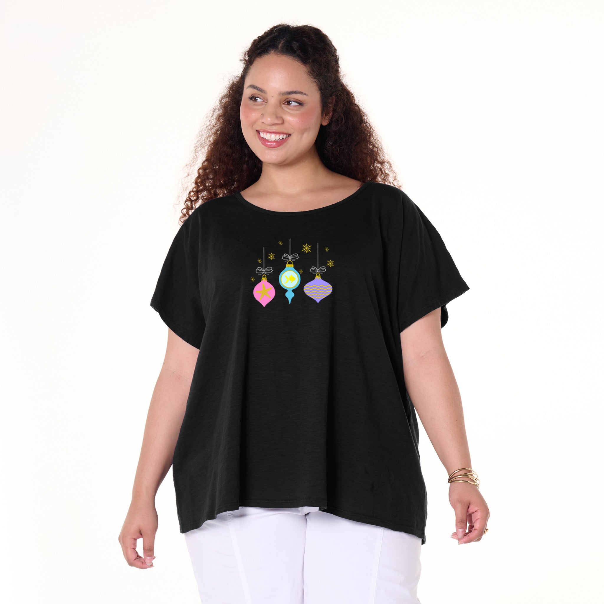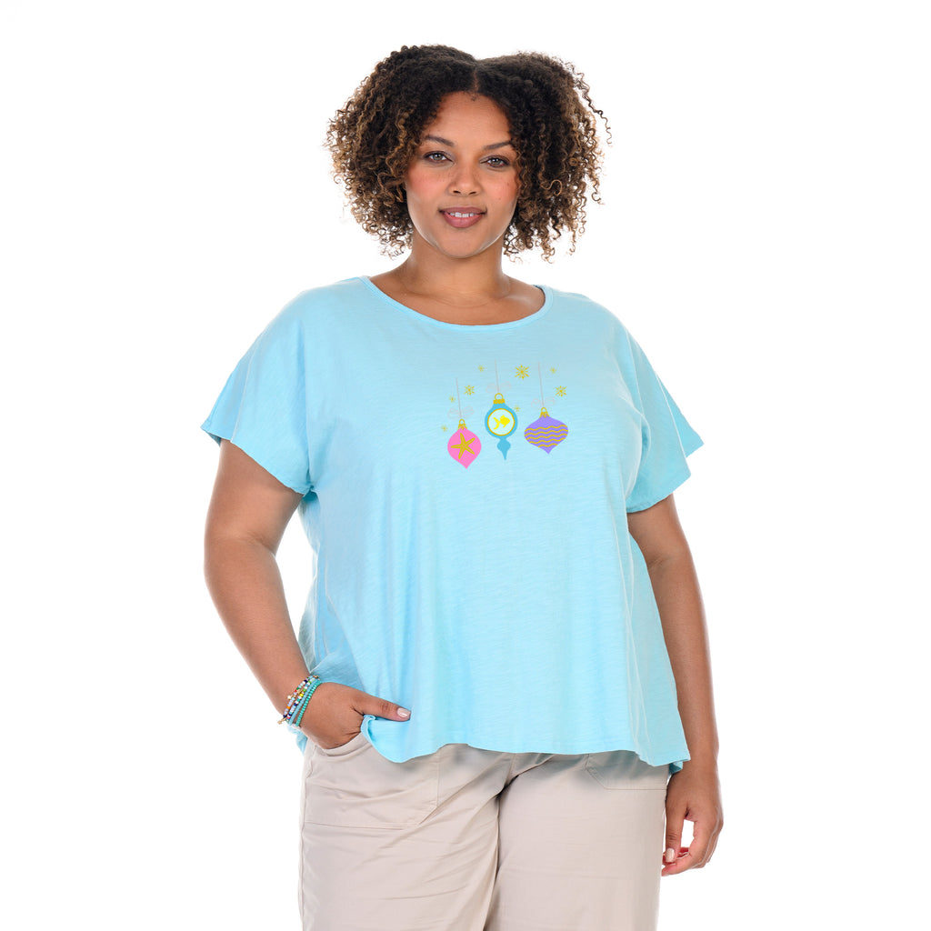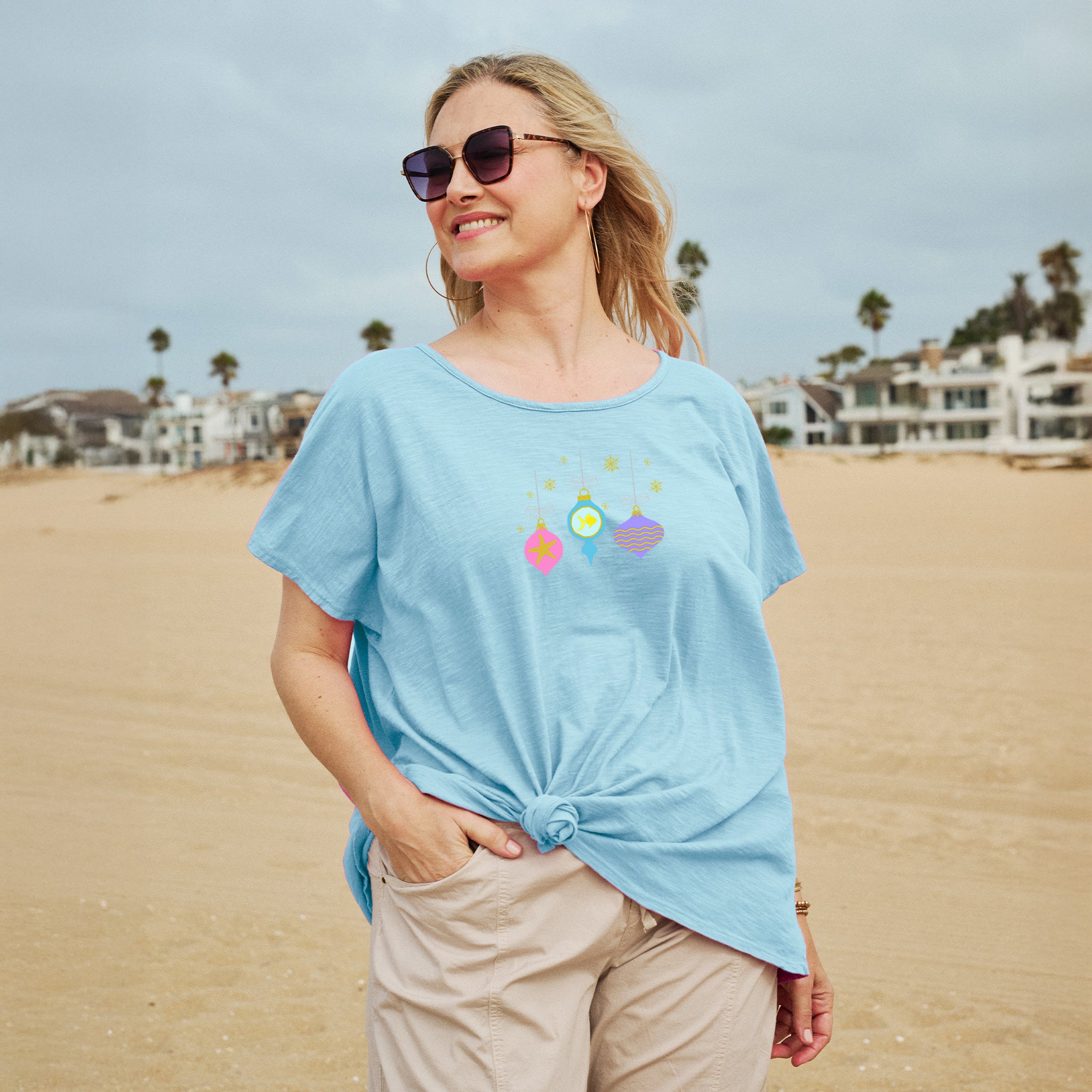 Show your holiday spirit this season in our exclusive FP Coastal Ornaments design featured on the Keepsake T. This style has a slouchy fit, round neckline and a straight hem. Length 27 1/4" and width 54 1/2" in this one-size T. Preshrunk. Machine wash cold, tumble dry low. 100% mid-weight cotton slub. Made in the USA. Model is 5'8".