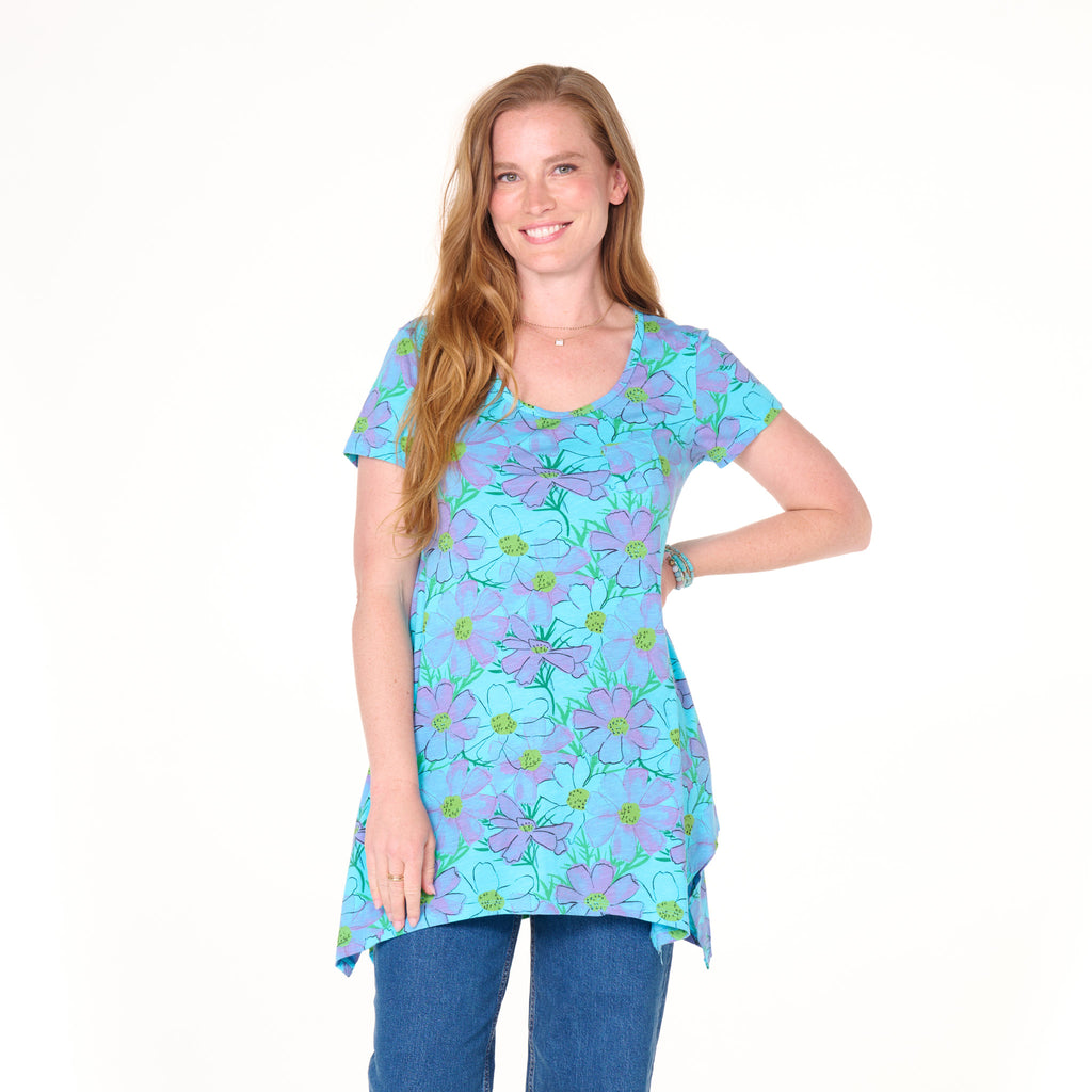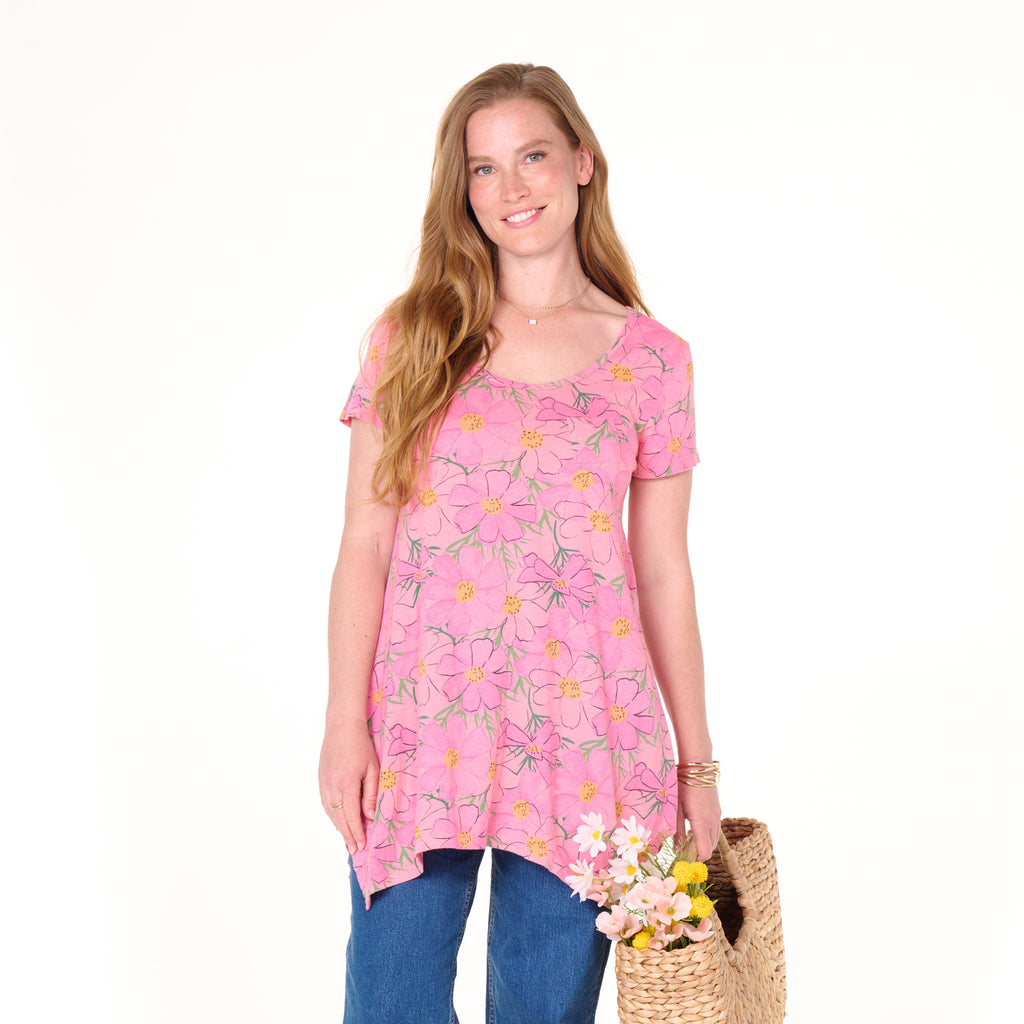 A fun new take on a classic scoop neck T, the Vintage Drape T features a pointed hemline, in a tunic length, tiny pocket detail on left chest, and featured in our colorful floral Spring Day print that feels like a warm, breezy afternoon.  This is a perfect style to wear as a cover-up or with your favorite bottoms.  Length 32"in size MD. Preshrunk. Machine wash cold, tumble dry low. 100% lightweight cotton slub jersey. Made in the USA. Model is 5'8" and wears a size small.