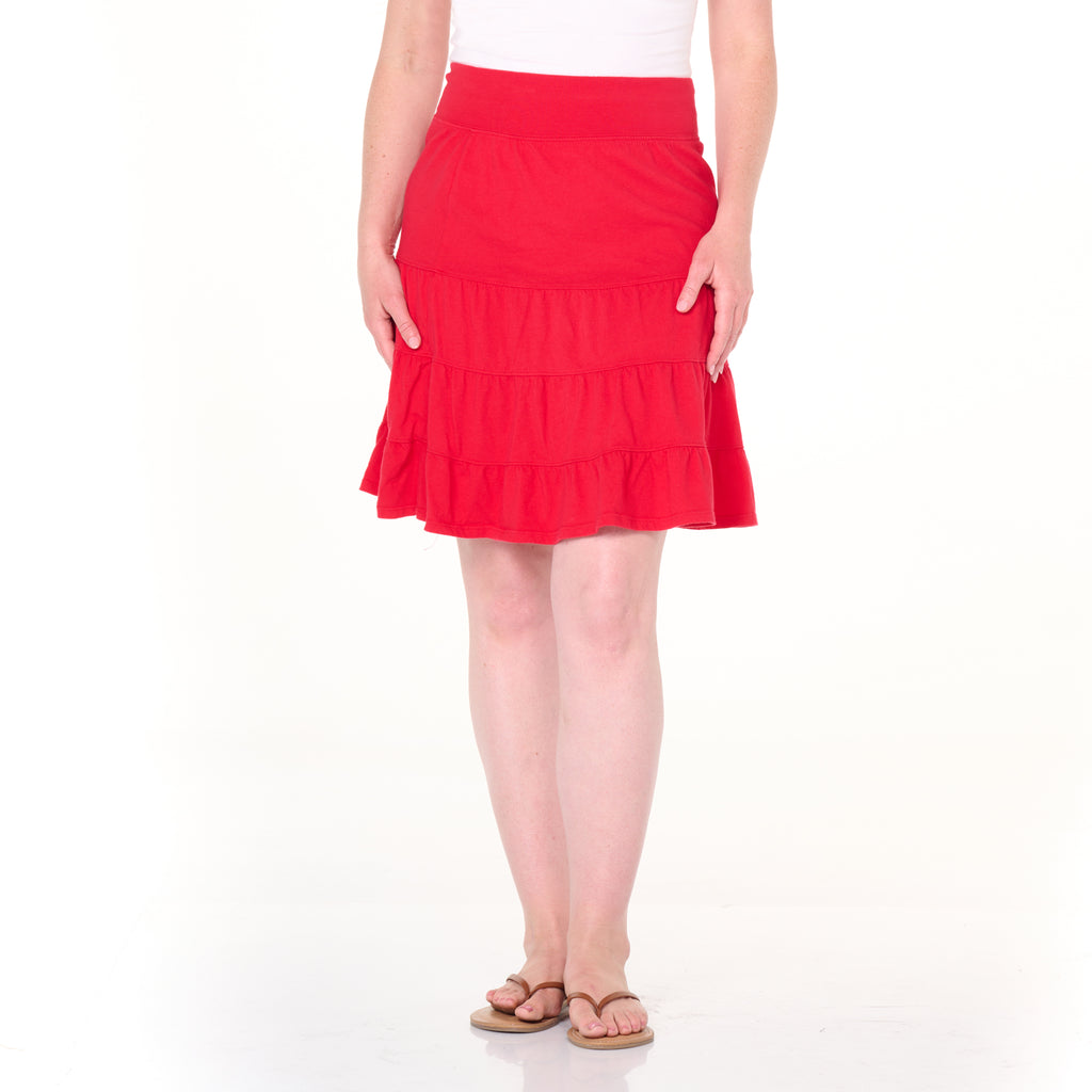 Destined to become your everyday go-to skirt, the flirty Jersey Tiered Skirt is simple and easy to wear. Classically stylish, comfortable for work or play, day or night. Features three tiers and flounce hem, flat rib cotton waistband, above the knee length. Length 20" in size MD. Preshrunk. Machine wash cold, tumble dry low. 100% soft cotton jersey. Made in USA. Model is 5'8" and wears a size small.