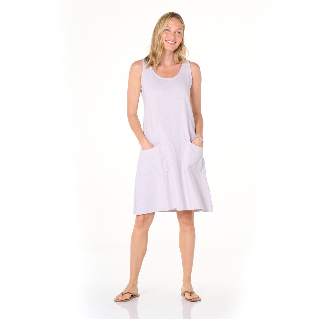 The Drape Dress is a fuss-free style, that is ready for your next sun-filled day. It features a scoop neckline, front patch pockets, and an effortless A-line shape. Falls to just above the knee. Length 37 1/2" in size MD. Preshrunk. Machine wash cold, tumble dry low. 100% mid-weight cotton slub. Made in USA. Model is 5'8" and wears a size small.
