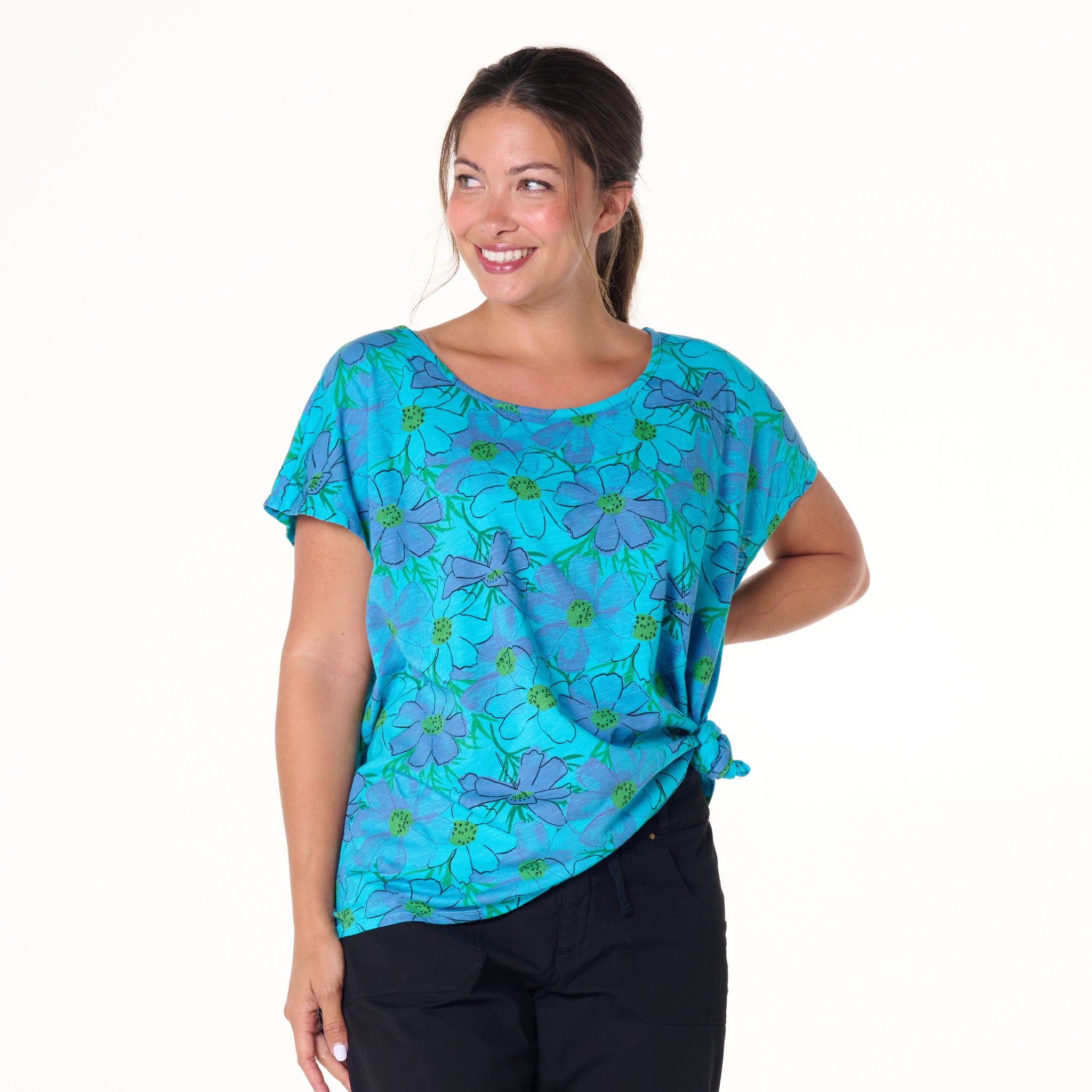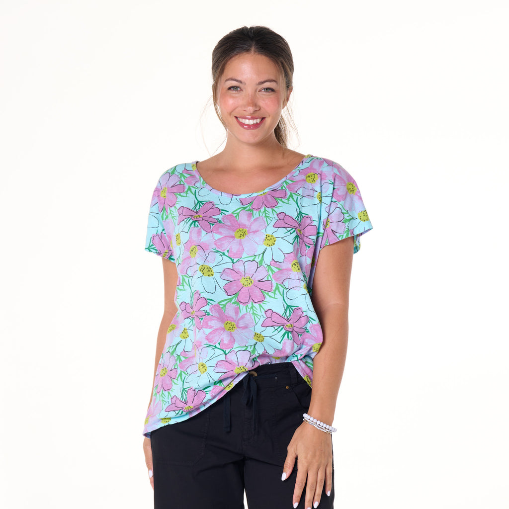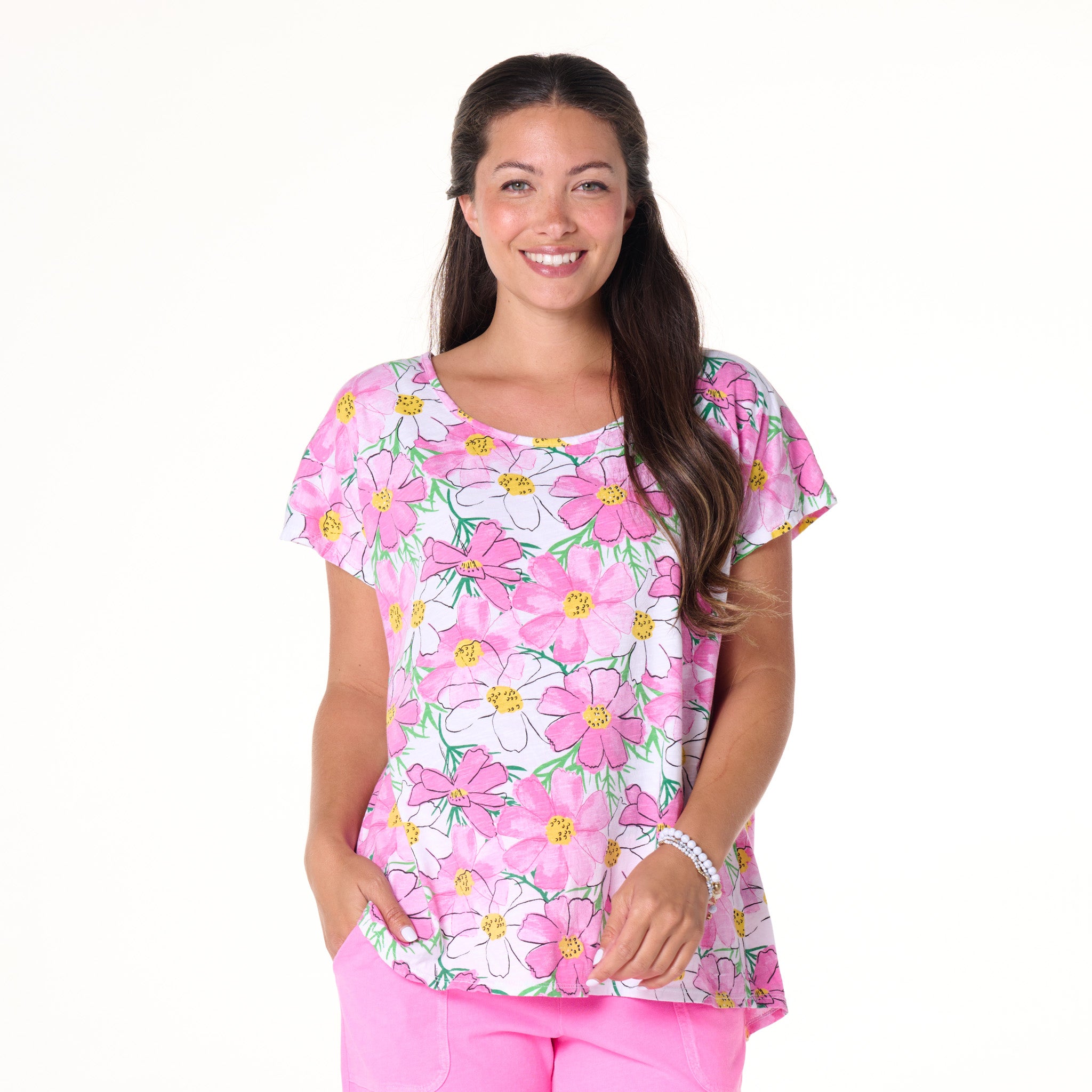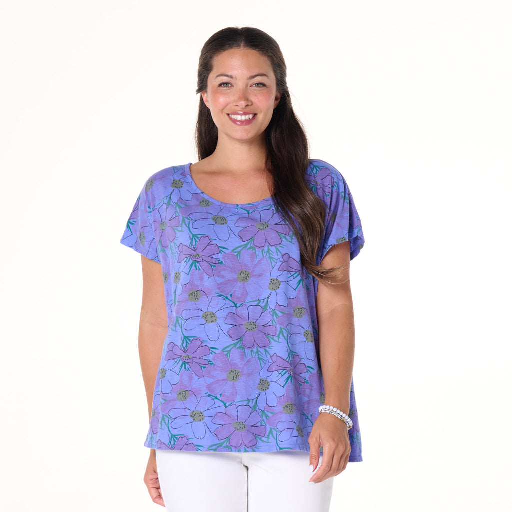 Comfortable and cool are the two words everyone uses to describe the one-size Keepsake T in the Spring Day colorful floral print.  Featuring a simple, easy fit that will pair wonderfully with your favorite pair of jeans or skirt. Round neckline. Straight hem. Length 24 1/2" and width 46" in this one-size T. Machine wash cold, tumble dry low. Preshrunk. 100% mid-weight cotton slub. Made in the USA. Model is 5'8".