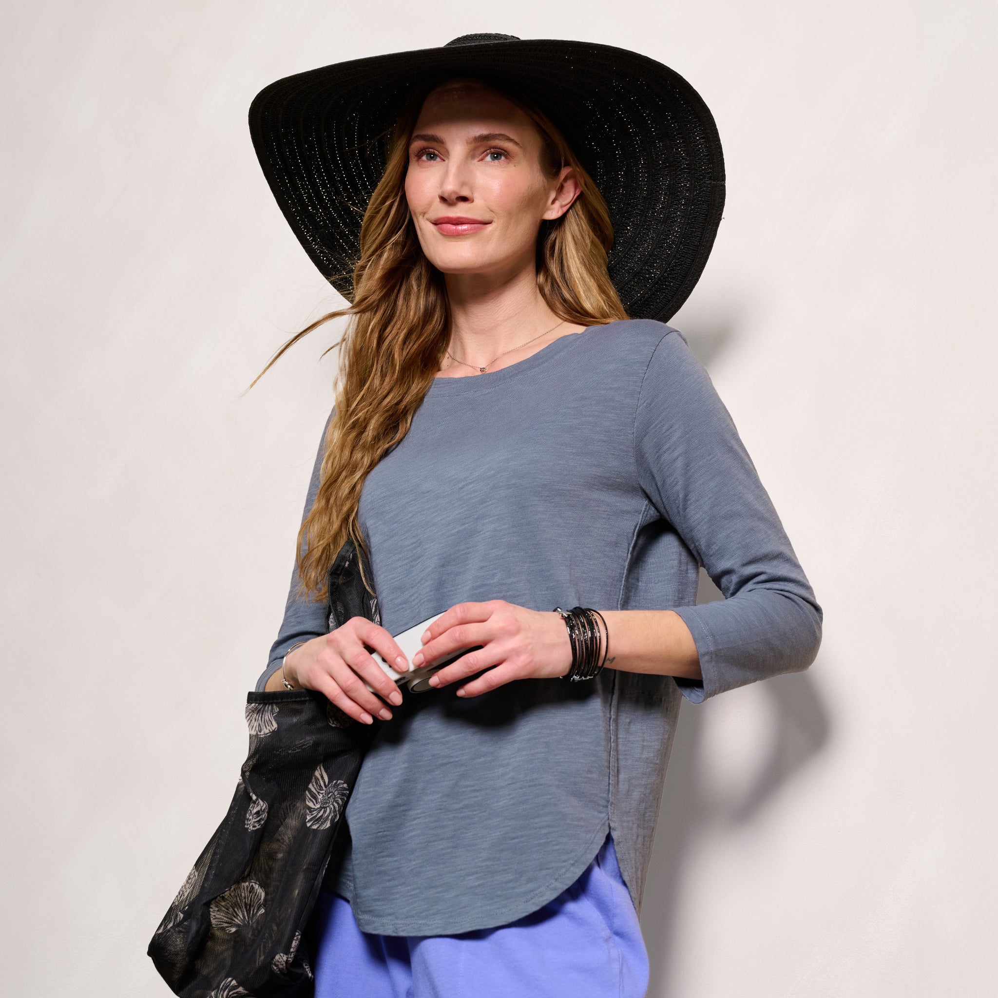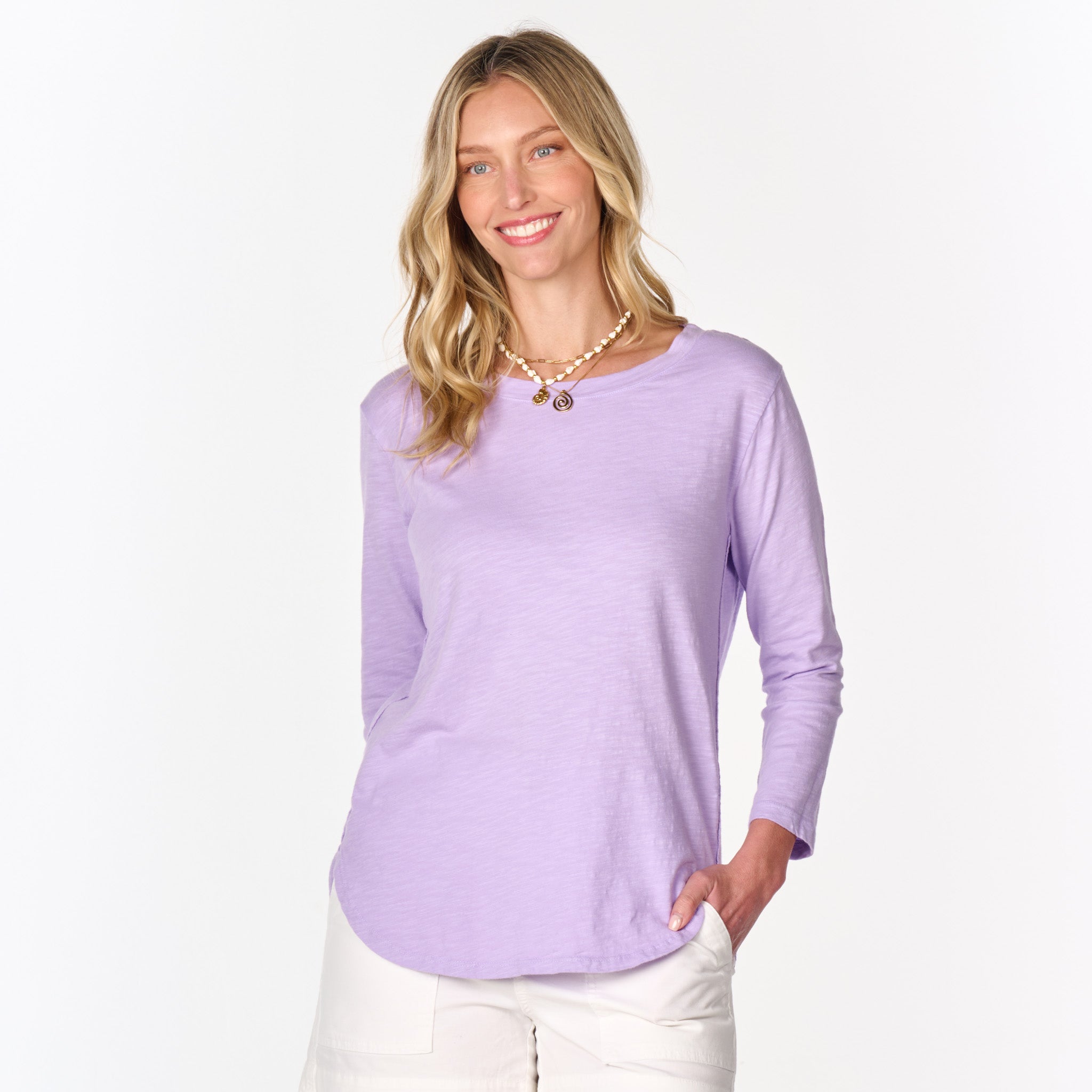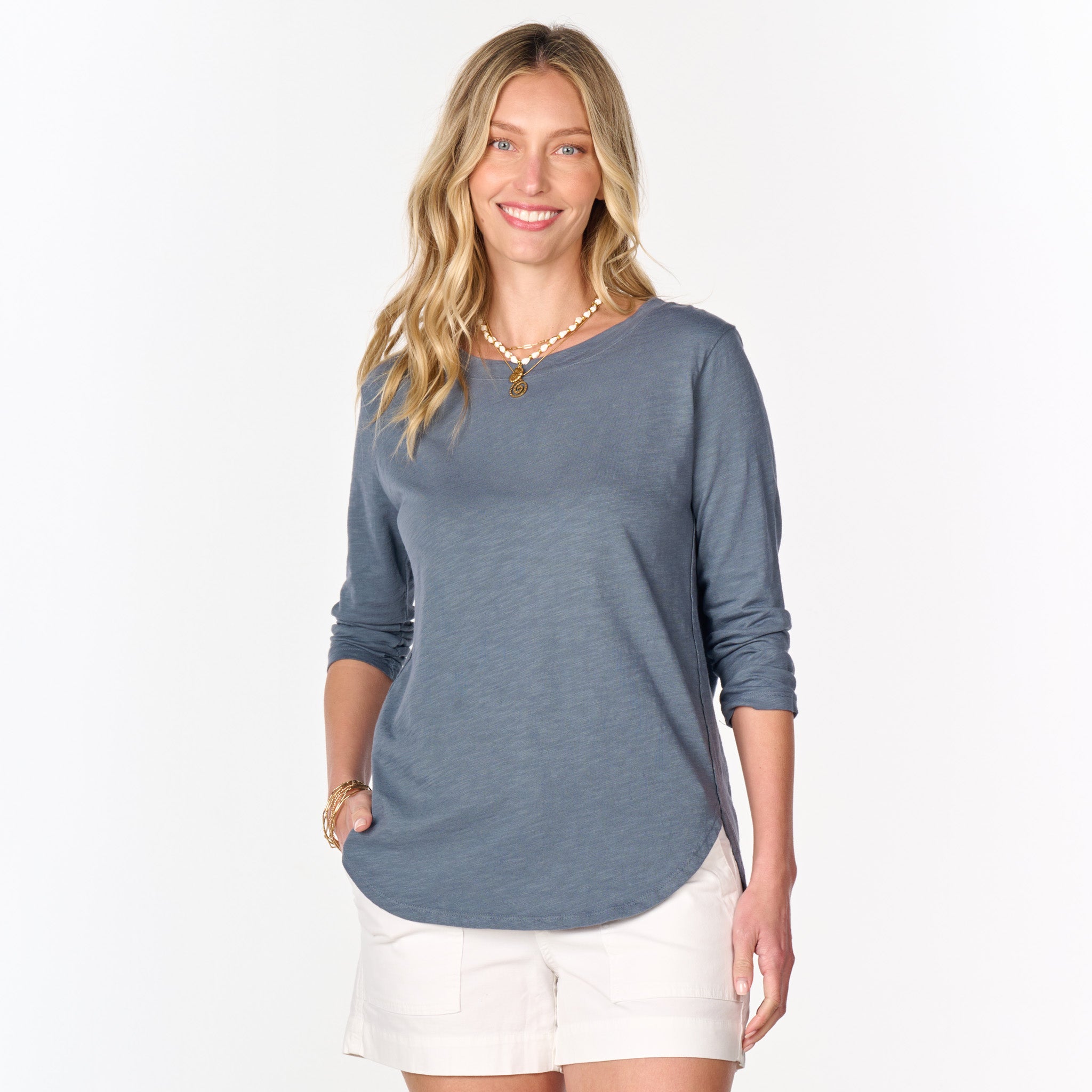 There's no such thing as having too many go-to basics! Our bestselling Catalina Top features a 3/4 sleeve body with overlapping side seams and a curved hemline. Dropped shoulder. Shallow scoop neckline with self trim. Length 25 3/4" in size MD. Preshrunk. Machine wash cold, tumble dry low. 100% mid-weight cotton slub. Made in the USA. Model is 5'8" and wears a size small.