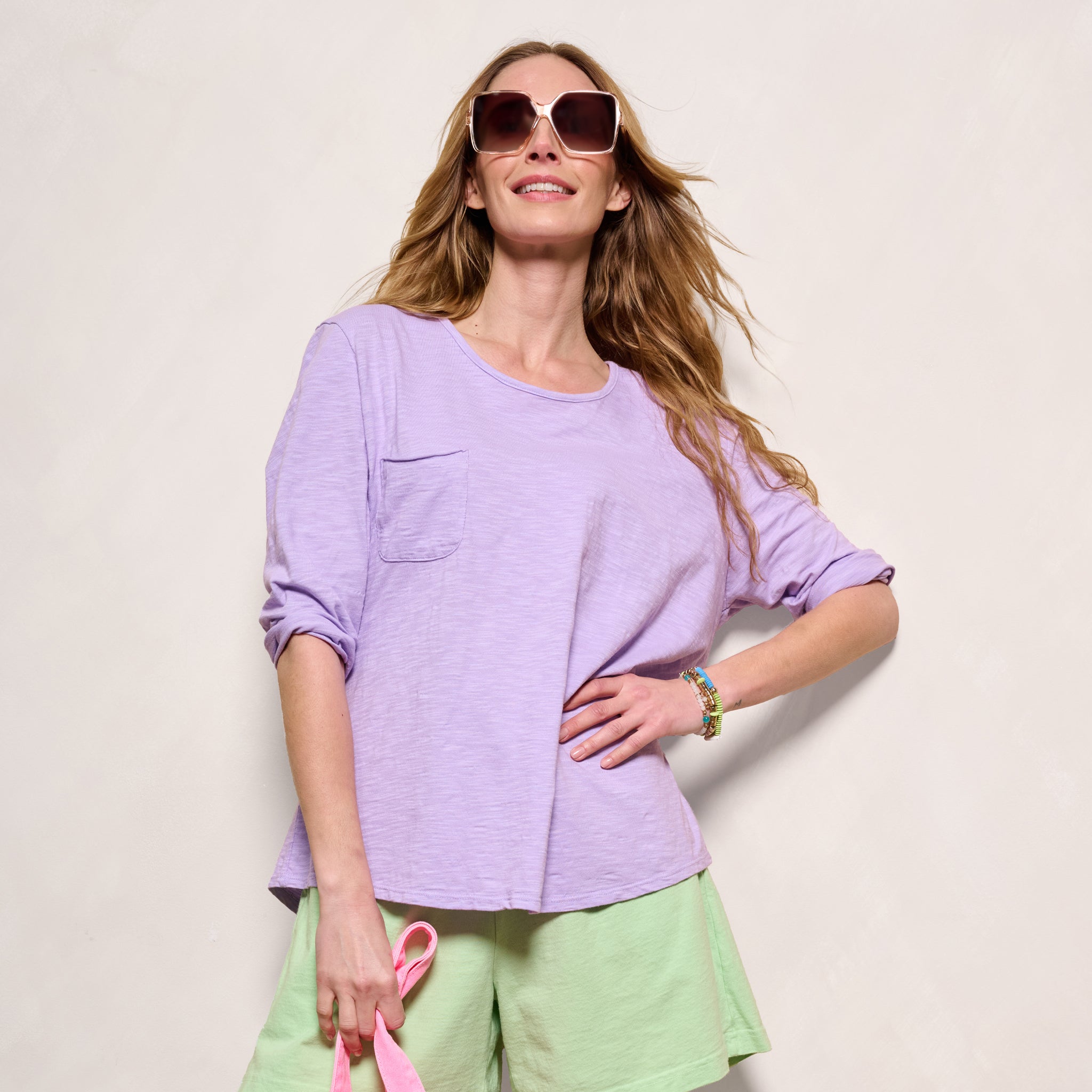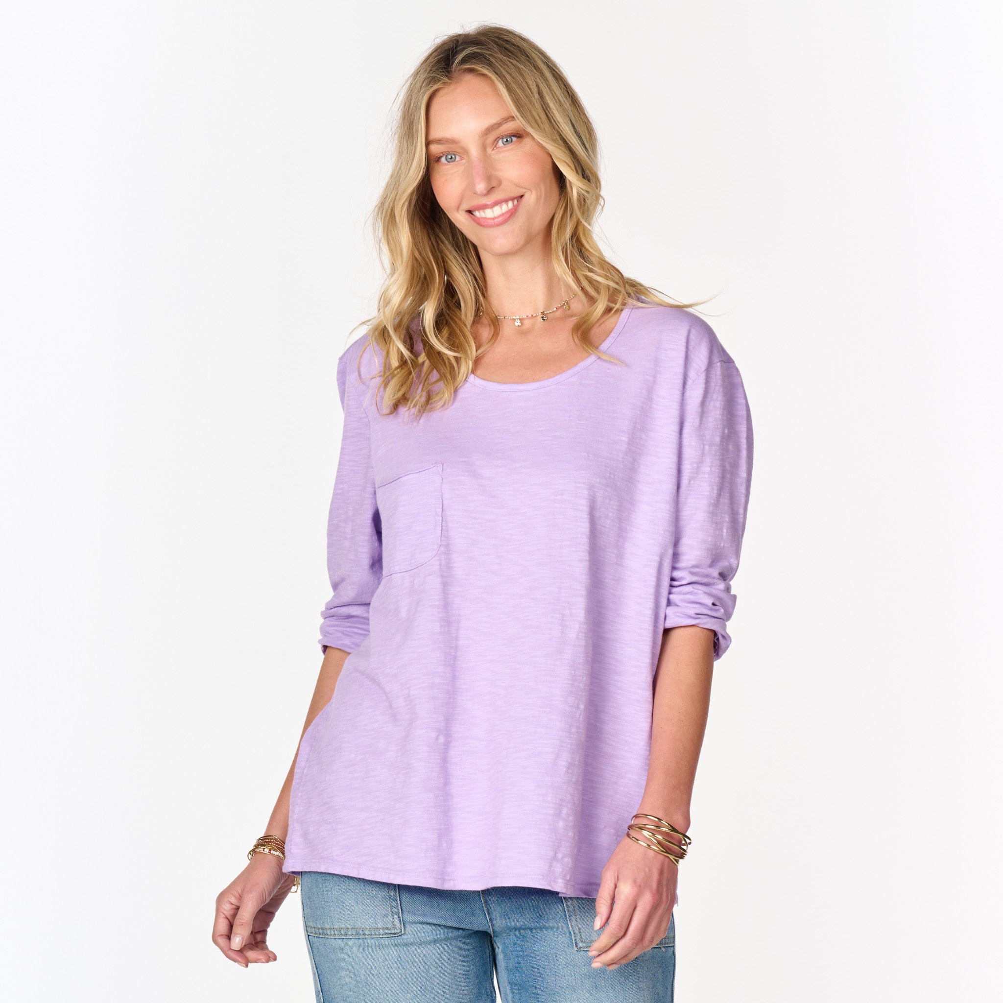 Effortless style of the One Size Forever top features a chic scoop-neck line, roomy drape fit, 3/4 sleeves, with an oversized raw edge chest pocket for a unique touch. These are the kind of tees everyone needs. Length 26" and width 47" in this one size top. Preshrunk. Machine wash cold, tumble dry low. 100% mid-weight cotton slub. Made in the USA. Model is 5'8".