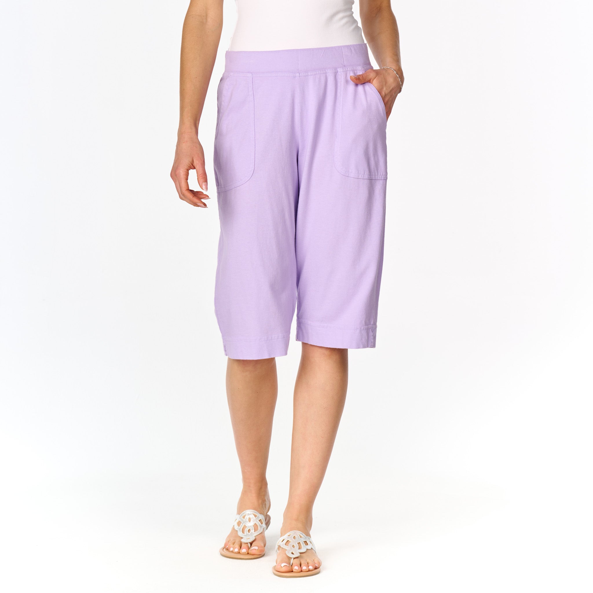 The Key Largo pedal pusher is a Bermuda style that is anything but basic. The effortless pull-on pedal pusher has a mid-rise with a straight-leg silhouette making it a staple for your outfits. Features deep side-seam pockets, flat elastic waistband that sits at your belly button, with side slit detail. 14 1/2" inseam. Preshrunk. Machine wash cold, tumble dry low. 100% soft cotton jersey. Made in the USA. Model is 5"8" and wears a size small.