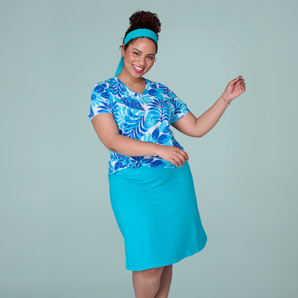 The Versatile T is anything but ordinary. Featured in Fiji Palm, this classic style has a V-neckline, wide bottom hem, and easy straight fitted style that will sure to go with everything. Length 25 1/2" in size 1X. Preshrunk. Machine wash cold, tumble dry low. 100% mid-weight cotton slub. Made in the USA. Model is 5'8" and wears a size 1X.