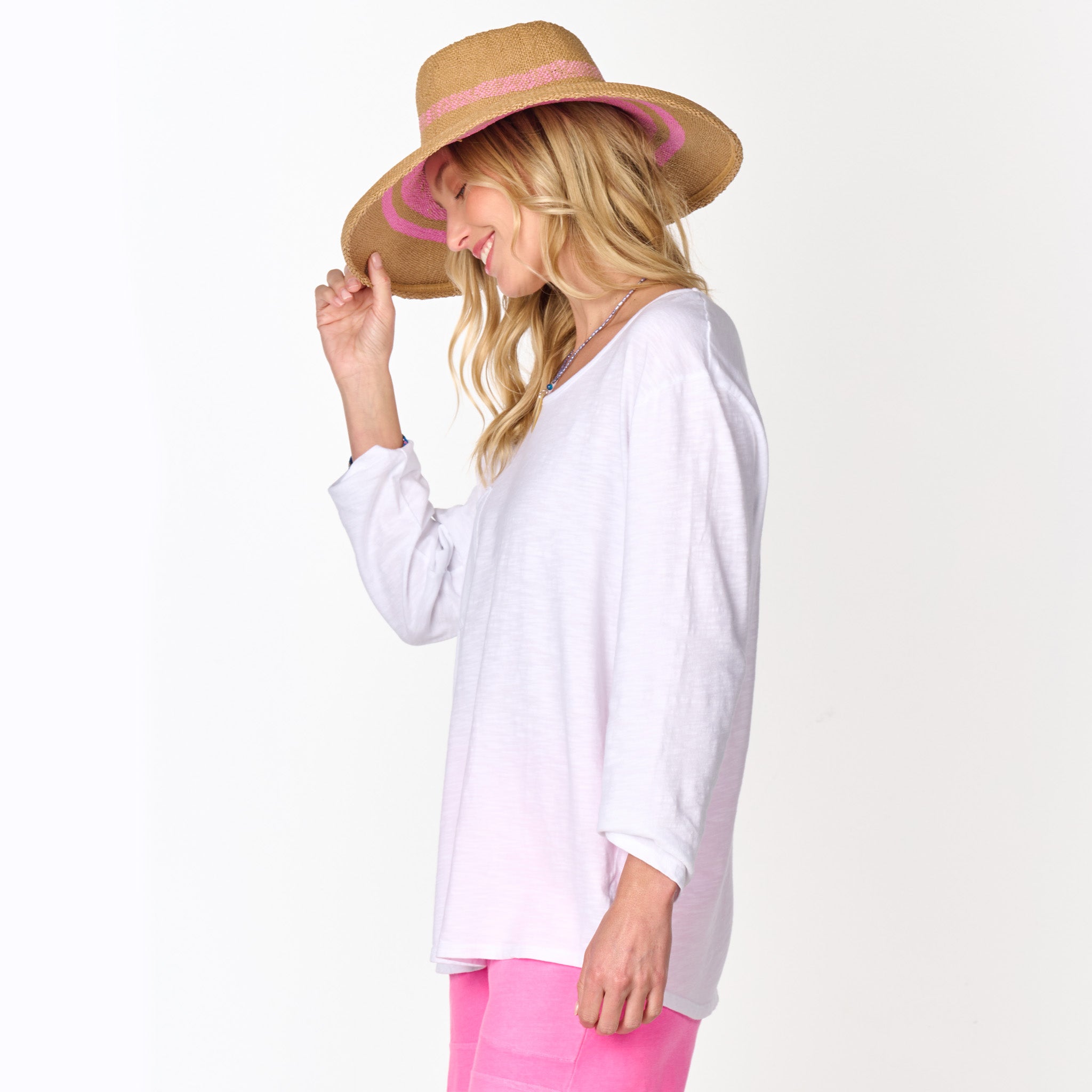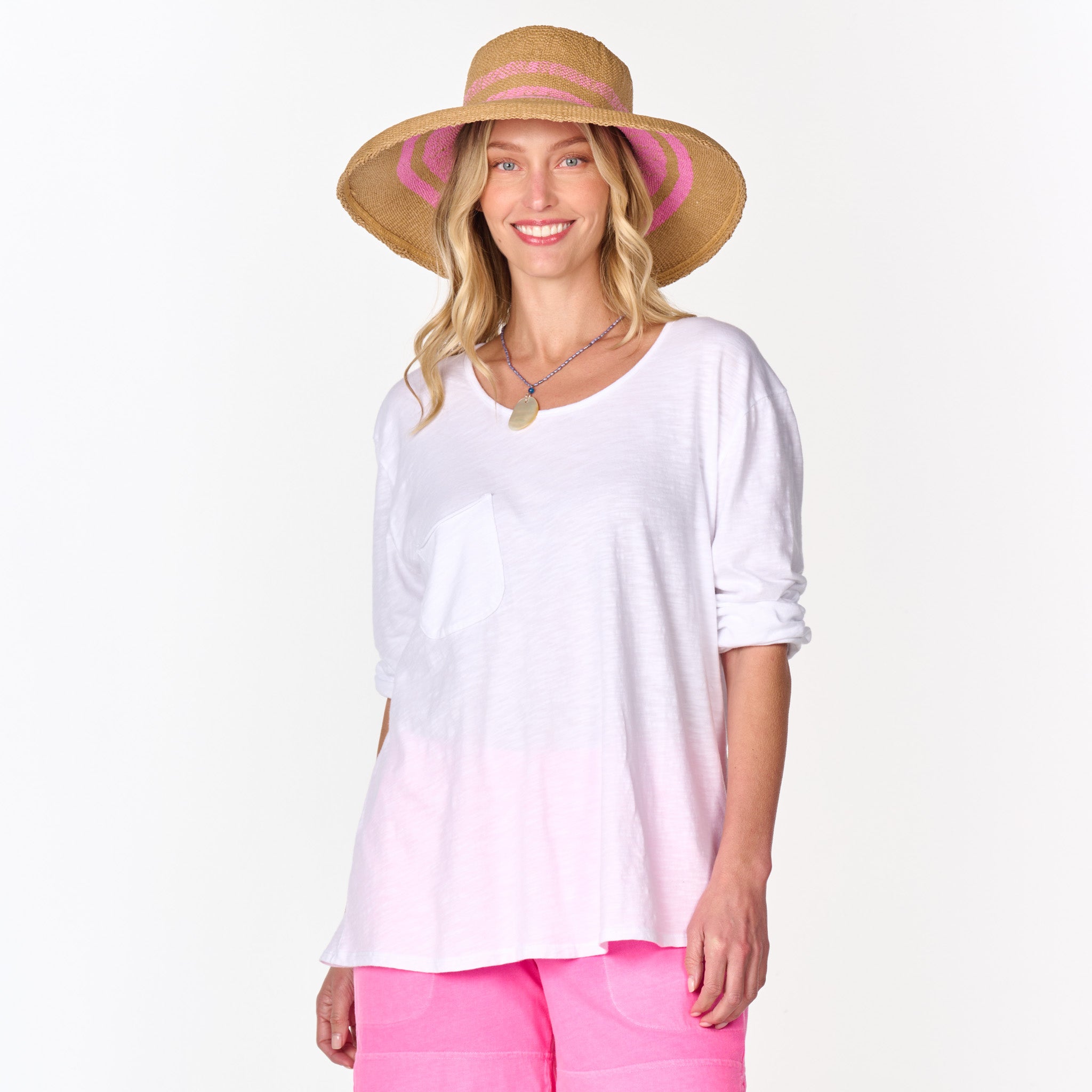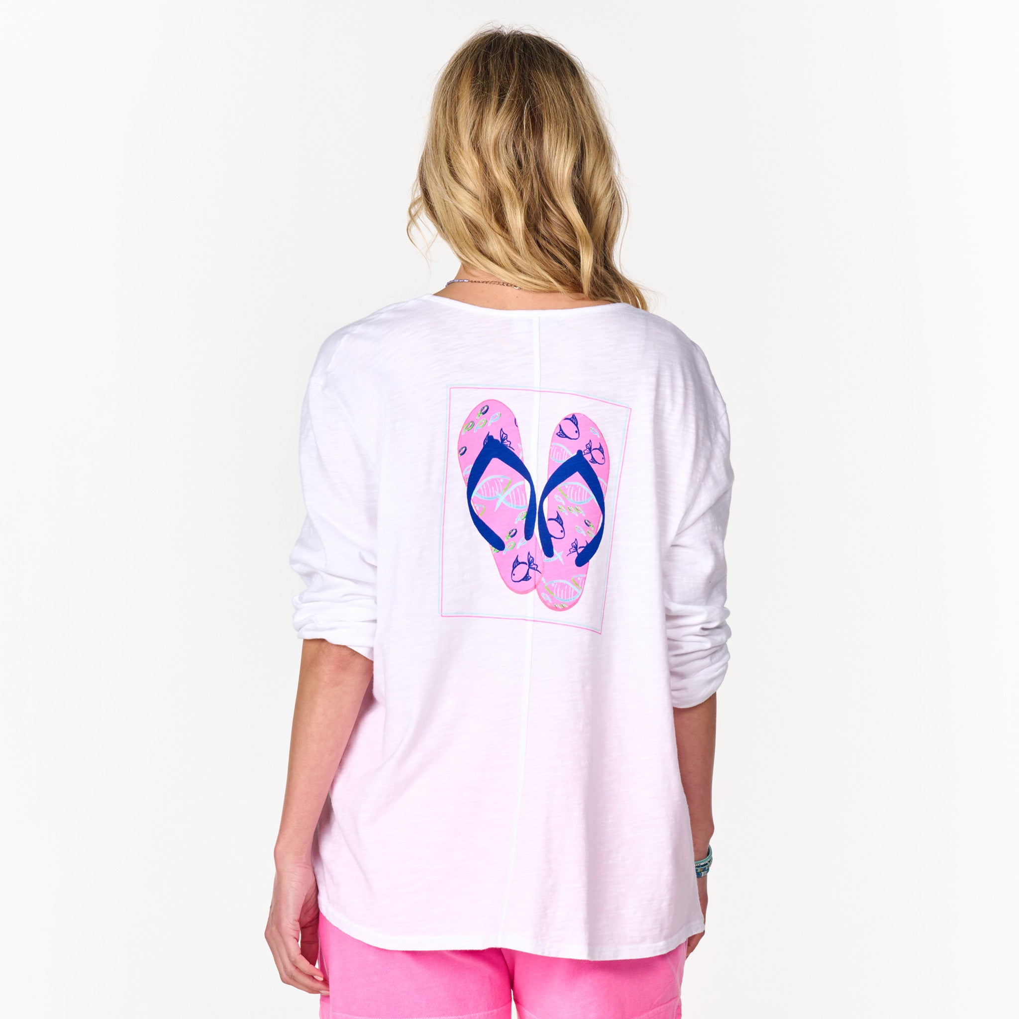 Enjoy your favorite Summer Flip Flops with a coastal beach feel in Fishy Flop. The Forever top features a chic scoop-neck line, roomy drape fit, 3/4 sleeves, with an oversized raw edge chest pocket for a unique touch. These are the kind of tees everyone needs. Length 26" and width 47" in this one size top. Preshrunk. Machine wash cold, tumble dry low. 100% mid-weight cotton slub. Made in the USA. Model is 5'8".