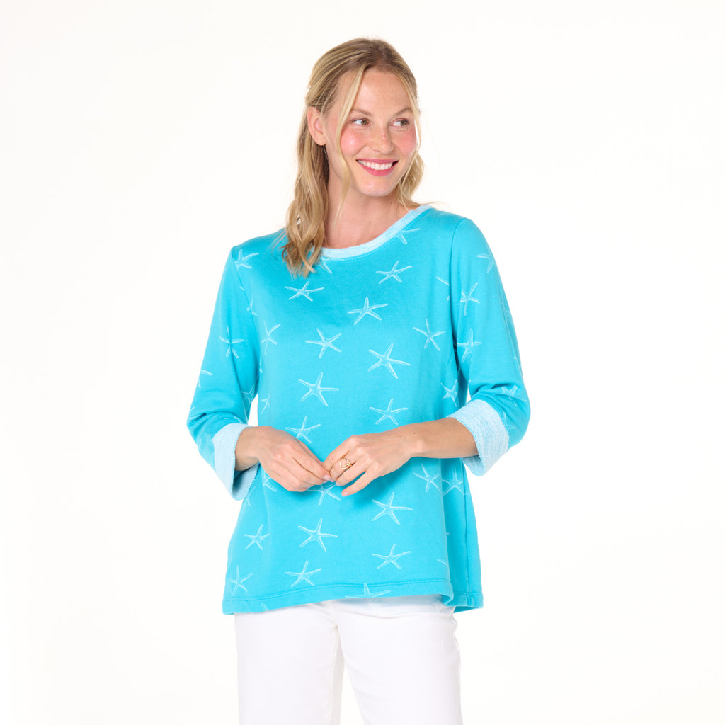 Inspired by the love of the ocean.   The Sea Star is a playful tonal print featured on our cozy Sunset Sweatshirt. The relaxed fit, soft loop french terry cotton, is also featured on the collar and cuff, which gives this a playful look. The style has a Scoop neckline, 3/4 sleeve, white loop cuff and neckline except for Cosmos that dyes to the garment color.  Length 26 3/4" size MD. Preshrunk. Machine wash cold, tumble dry low. 42% polyester-30% modal-28% cotton. Made in the USA. Model is 5'8" and wears a size small.