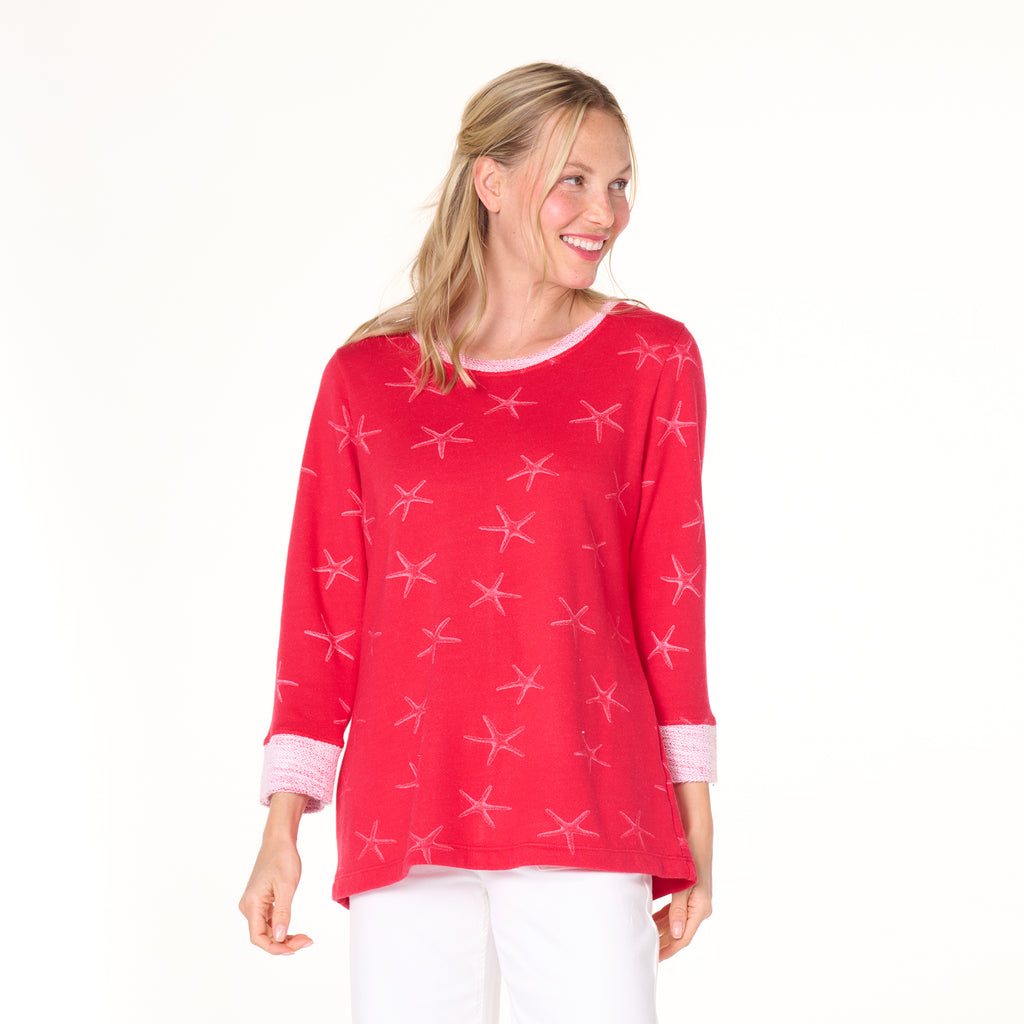 Inspired by the love of the ocean.   The Sea Star is a playful tonal print featured on our cozy Sunset Sweatshirt. The relaxed fit, soft loop french terry cotton, is also featured on the collar and cuff, which gives this a playful look. The style has a Scoop neckline, 3/4 sleeve, white loop cuff and neckline except for Cosmos that dyes to the garment color.  Length 26 3/4" size MD. Preshrunk. Machine wash cold, tumble dry low. 42% polyester-30% modal-28% cotton. Made in the USA. Model is 5'8" and wears a size small.