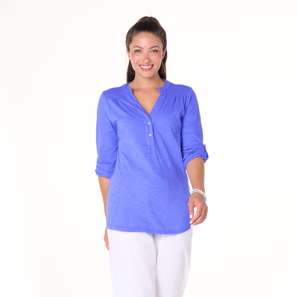 A tried-and-true wardrobe staple, our 3/4 sleeve Buttonside Henley can be dressed up or down.   This easy fit pullover henley has roll-up cuffs with button tabs, front functional buttons, and scoop hemline.  It's perfect for all seasons.   Length 26" in size MD. Preshrunk. Machine wash cold, tumble dry low. 100% mid-weight cotton slub. Made in the USA. Model is 5'8" and wears a size small.