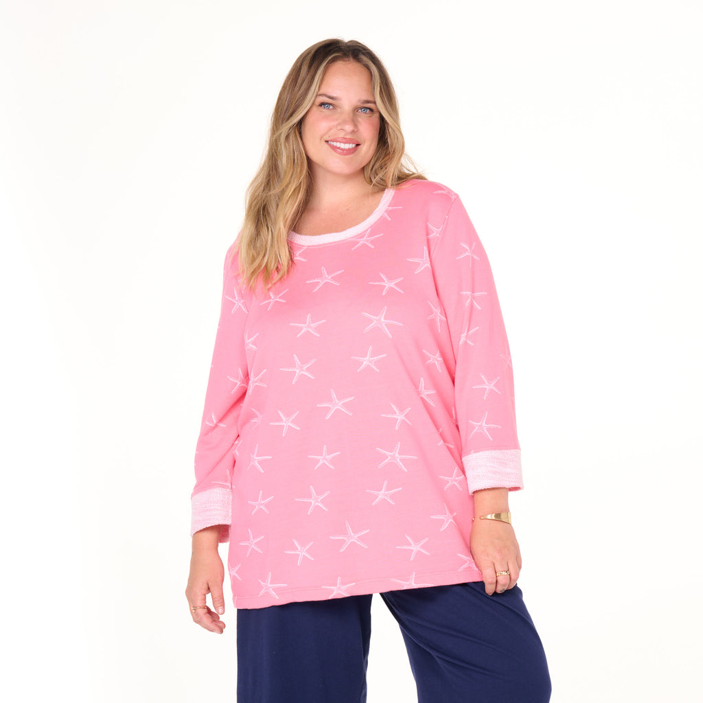 Inspired by the love of the ocean. The Sea Star is a playful tonal print featured on our cozy Sunset Sweatshirt. The relaxed fit, soft loop french terry cotton, is also featured on the collar and cuff, which gives this a playful look. The style has a Scoop neckline, 3/4 sleeve, white loop cuff and neckline except for Cosmos that dyes to the garment color. Length 28 1/2" size 1X. Preshrunk. Machine wash cold, tumble dry low. 42% polyester-30% modal-28% cotton. Made in the USA. Model is 5'8" and wears a size 1X.