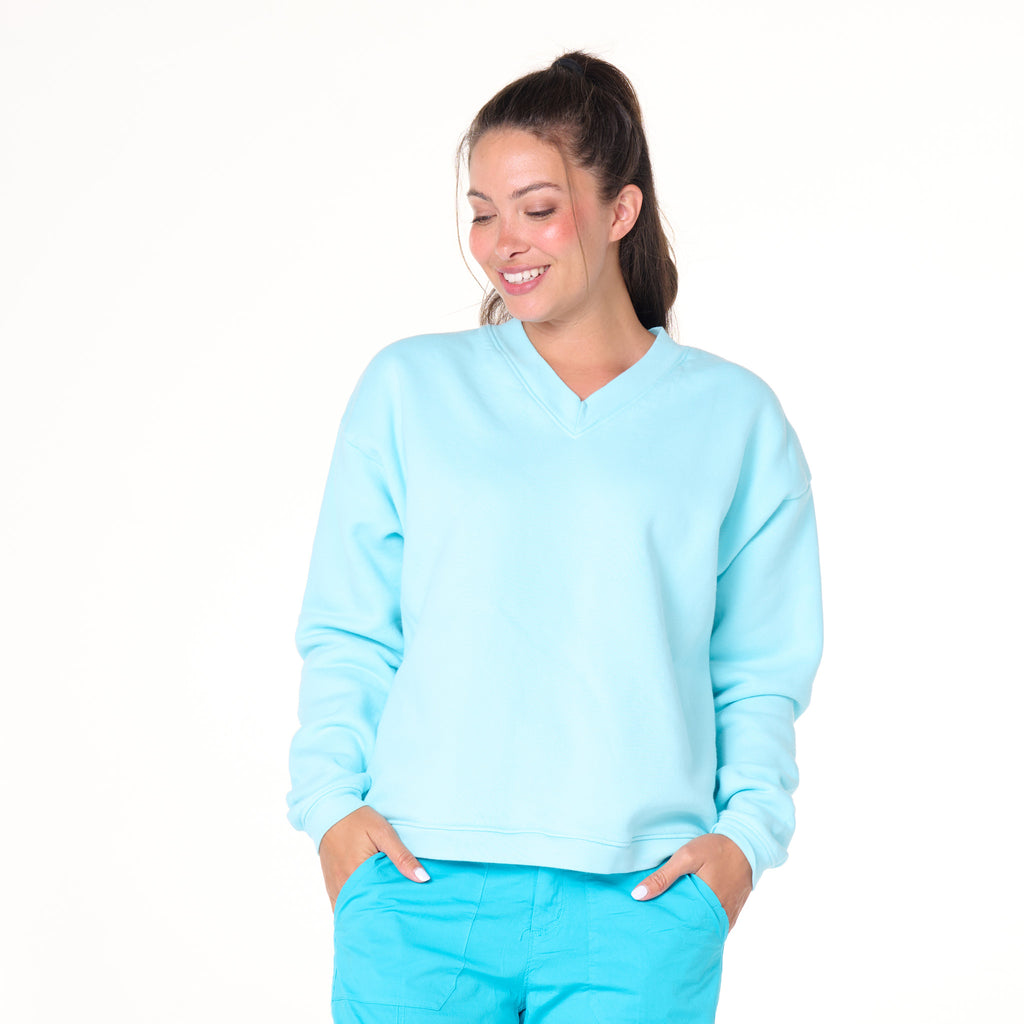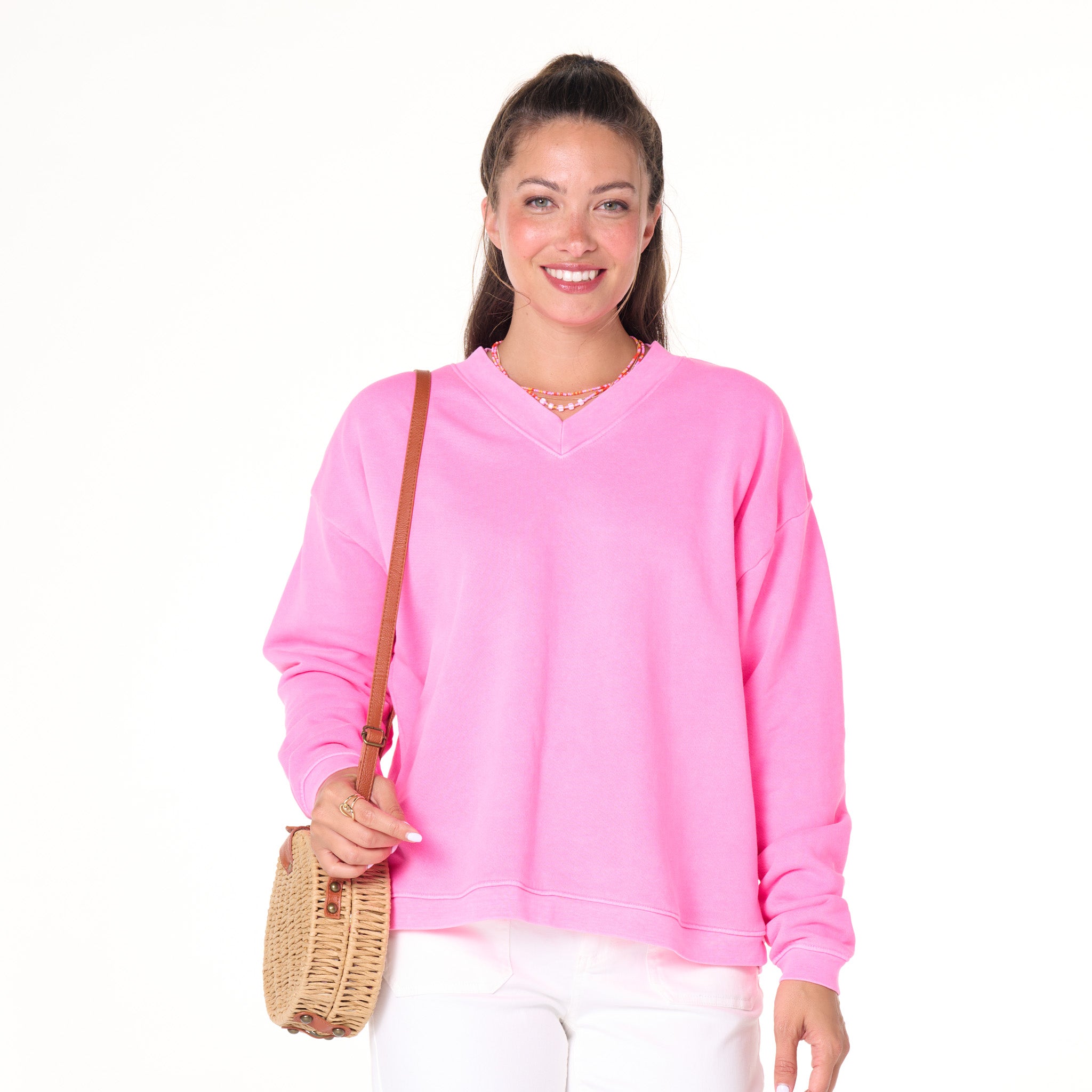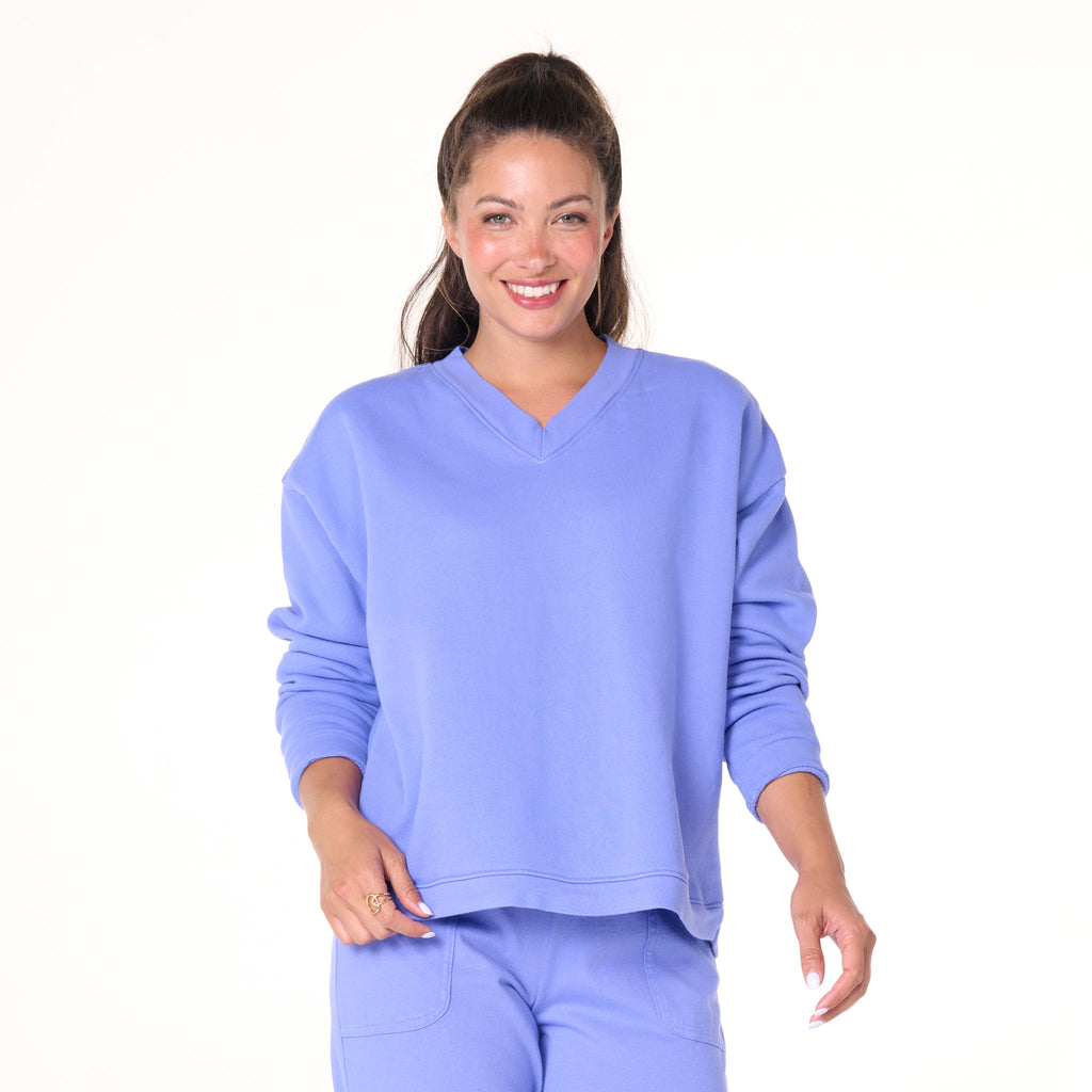 Kick back and relax in our Crop Easy V Neck Sweatshirt. This effortless pullover is featured in a boxy cut, long sleeve, ribbed cuffs and neckline. It's the perfect style in a 100% cotton fleece for a lived-in feel. Length 24 1/2" size MD. Preshrunk. Machine wash cold, tumble dry low. 100% cotton fleece. Made in the USA. Model is 5'8" and wears a size small.
