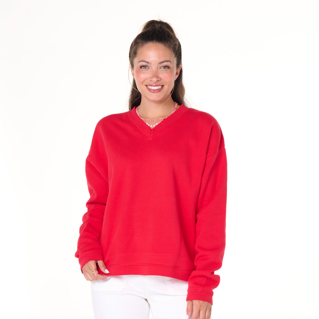 Kick back and relax in our Crop Easy V Neck Sweatshirt. This effortless pullover is featured in a boxy cut, long sleeve, ribbed cuffs and neckline. It's the perfect style in a 100% cotton fleece for a lived-in feel. Length 24 1/2" size MD. Preshrunk. Machine wash cold, tumble dry low. 100% cotton fleece. Made in the USA. Model is 5'8" and wears a size small.