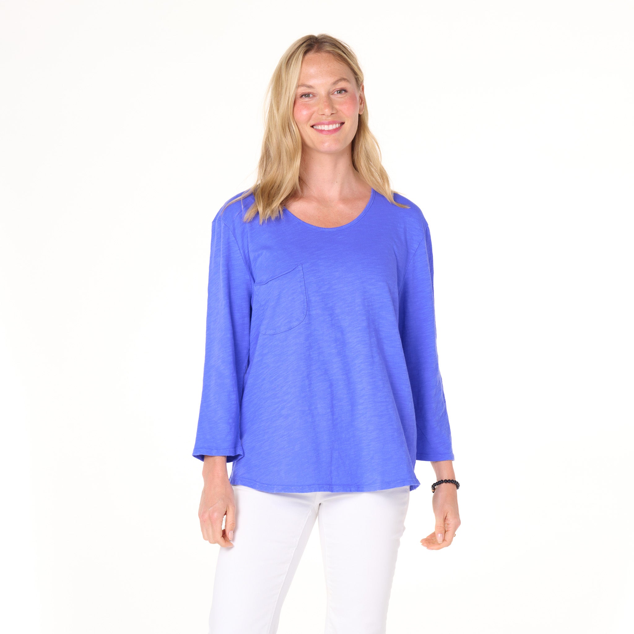 Effortless style of the One Size Forever top features a chic scoop-neck line, roomy drape fit, 3/4 sleeves, with an oversized raw edge chest pocket for a unique touch.  These are the kind of tees everyone needs.  Length 26" and width 47" in this one size top. Preshrunk. Machine wash cold, tumble dry low. 100% mid-weight cotton slub. Made in the USA. Model is 5'8".