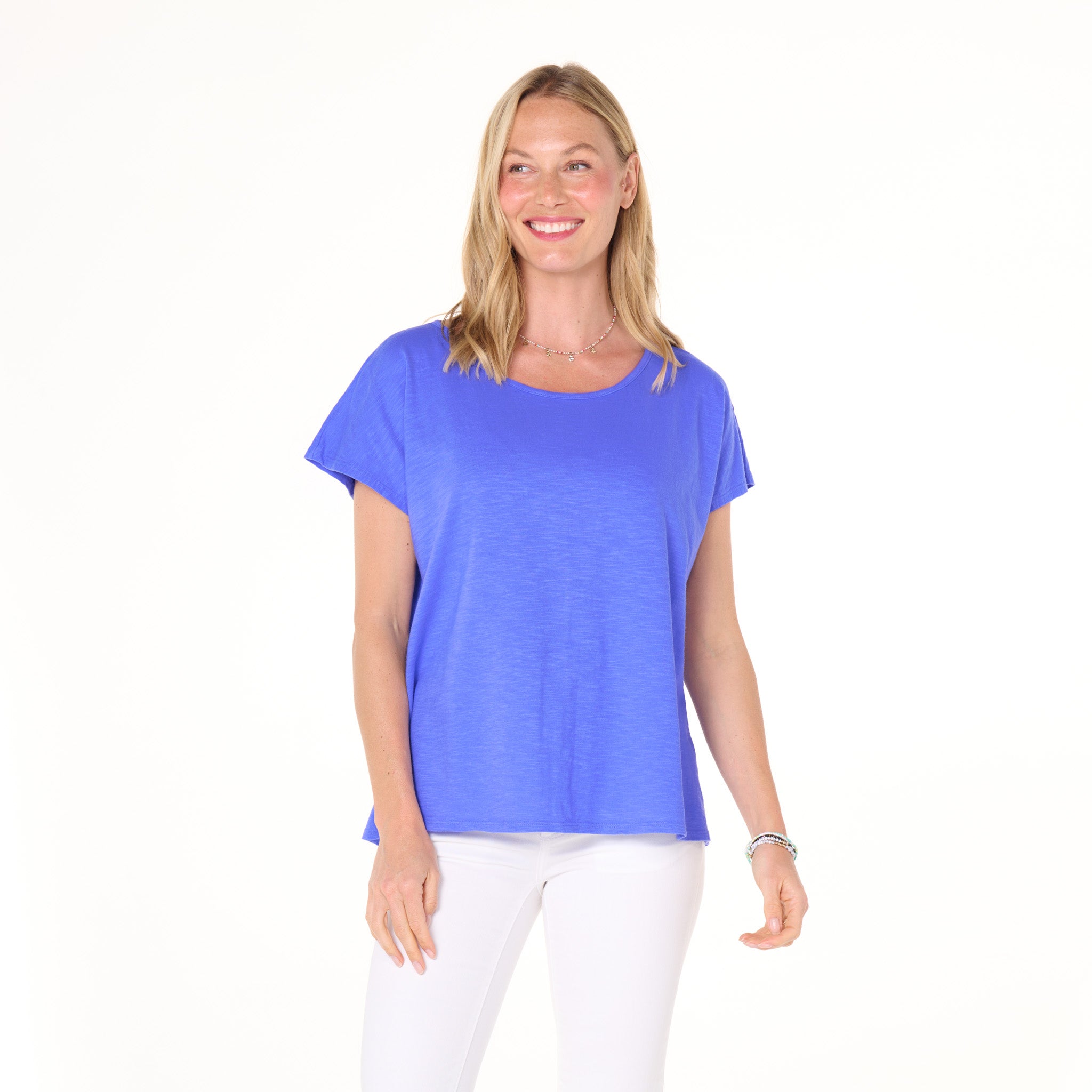 Comfortable and cool are the two words everyone uses to describe the one-size Keepsake T. Featuring a simple, slouchy fit, round neckline and straight hem that will pair with your favorite bottom. Length 24 1/2" and width 46" in this one-size T. Preshrunk. Machine wash cold, tumble dry low. 100% mid-weight cotton slub. Made in the USA. Model is 5'8".