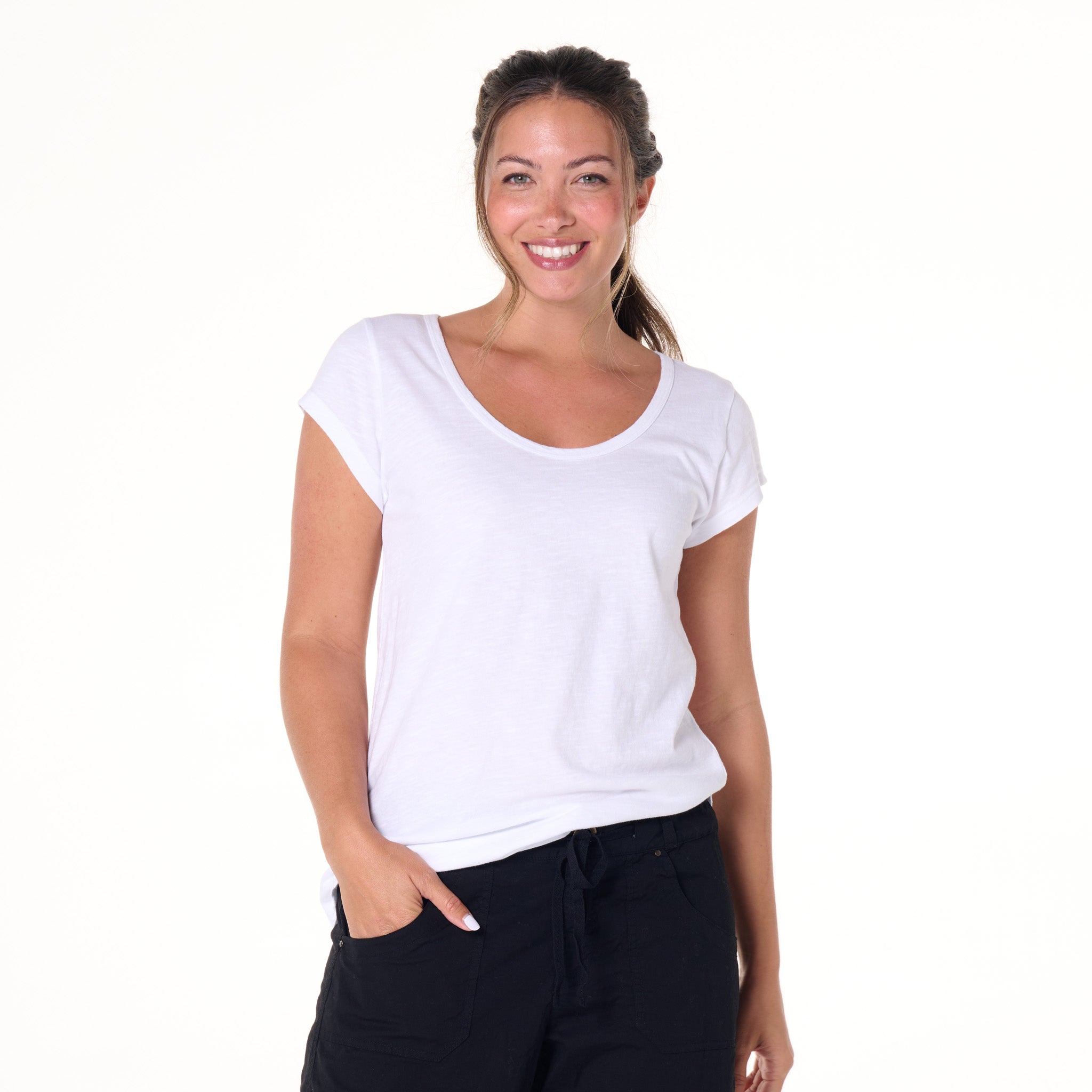 The Vintage Scoop Neck T is anything but simple with a slimming shape, cap sleeves and lightweight to be worn tucked in or out in your favorite bottoms. Length 25" in size MD. Preshrunk. Machine wash cold, tumble dry low. 100% lightweight cotton slub. Made in the USA. Model is 5'8" and wears a size small.