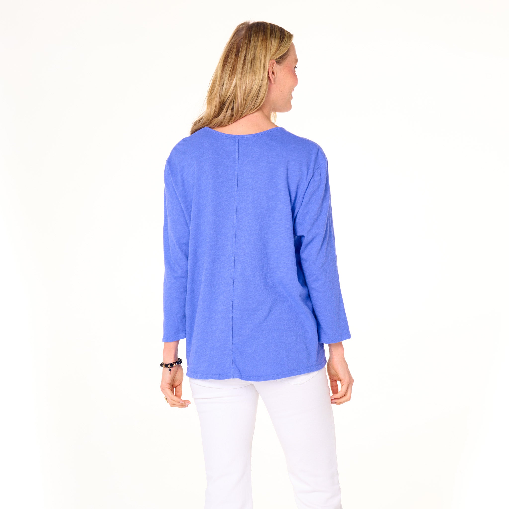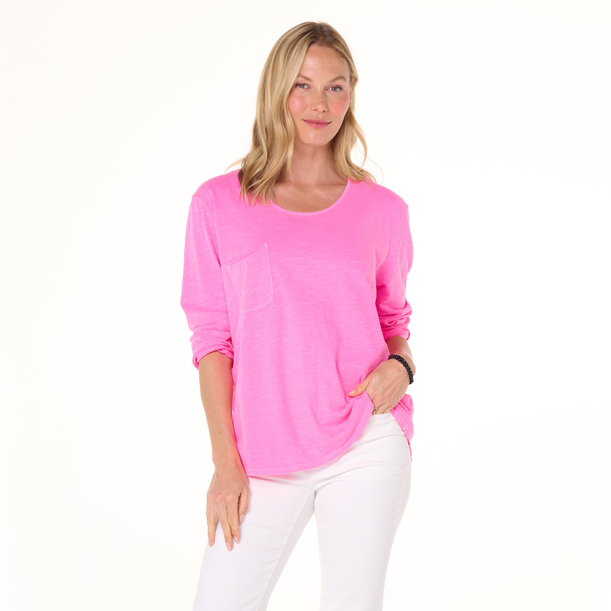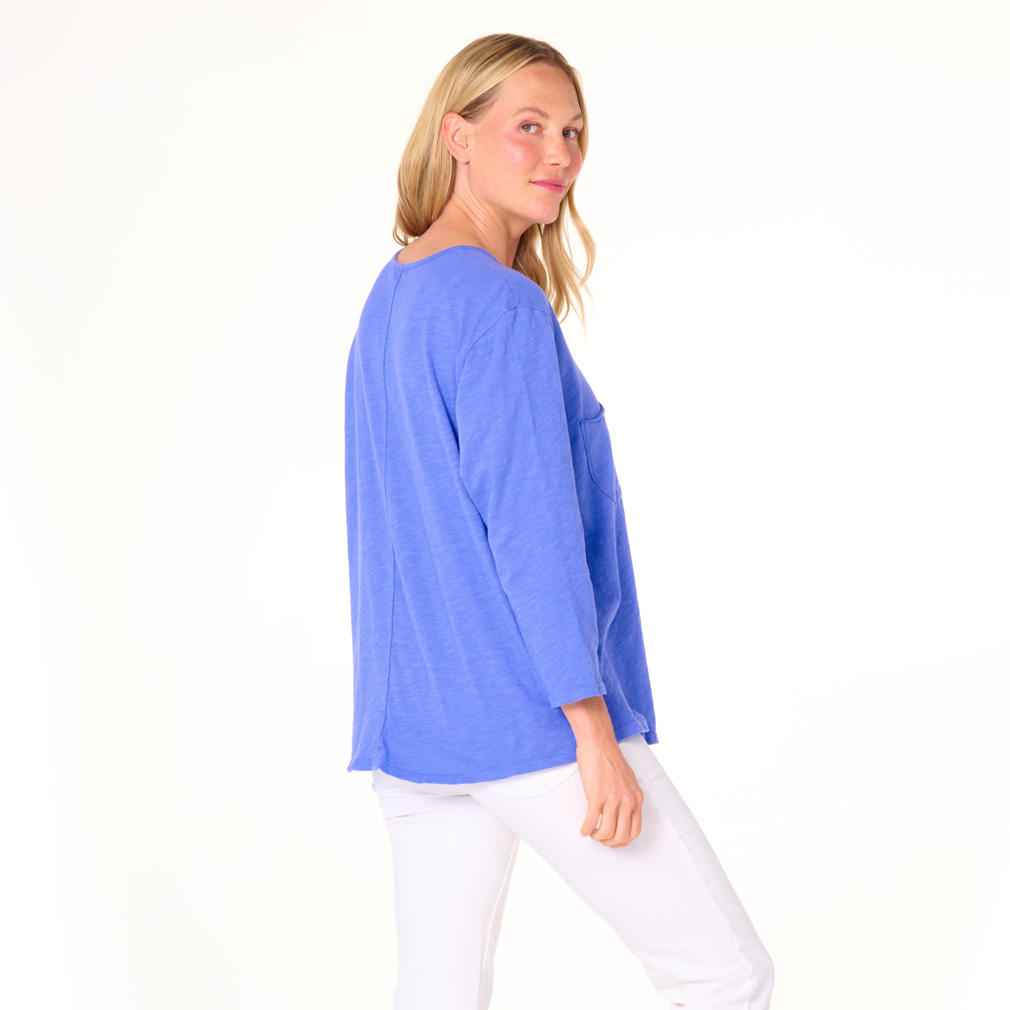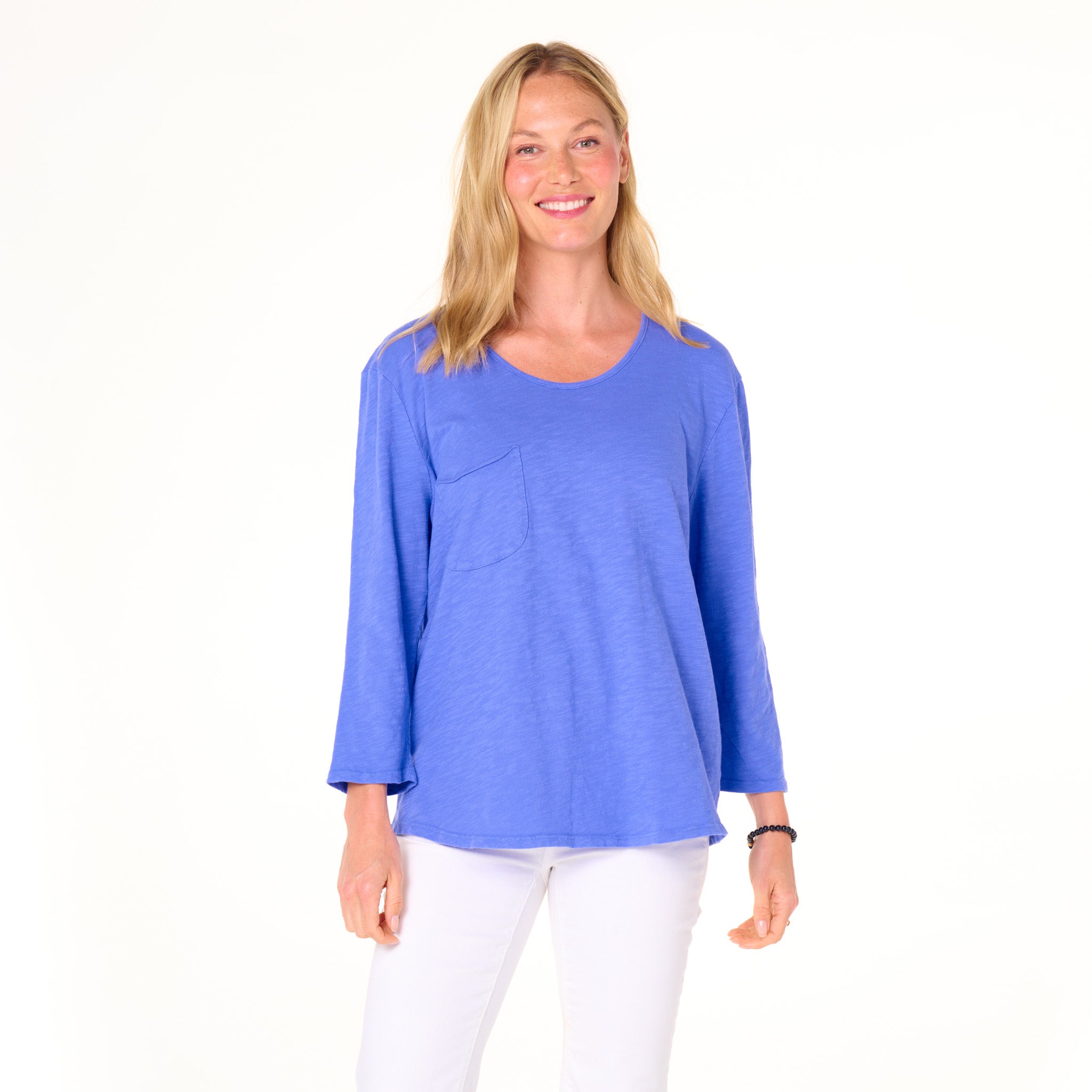 Effortless style of the One Size Forever top features a chic scoop-neck line, roomy drape fit, 3/4 sleeves, with an oversized raw edge chest pocket for a unique touch. These are the kind of tees everyone needs. Length 26" and width 47" in this one size top. Preshrunk. Machine wash cold, tumble dry low. 100% mid-weight cotton slub. Made in the USA. Model is 5'8".