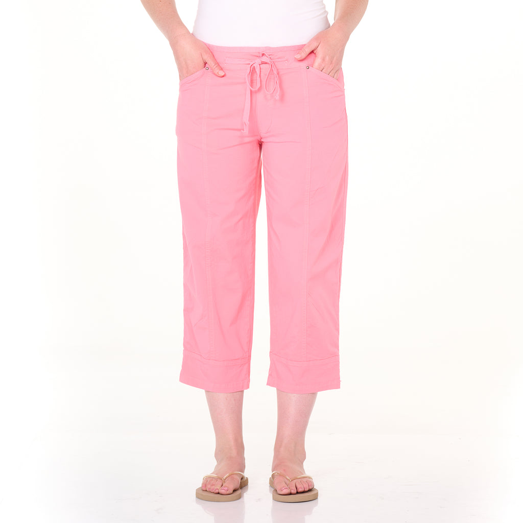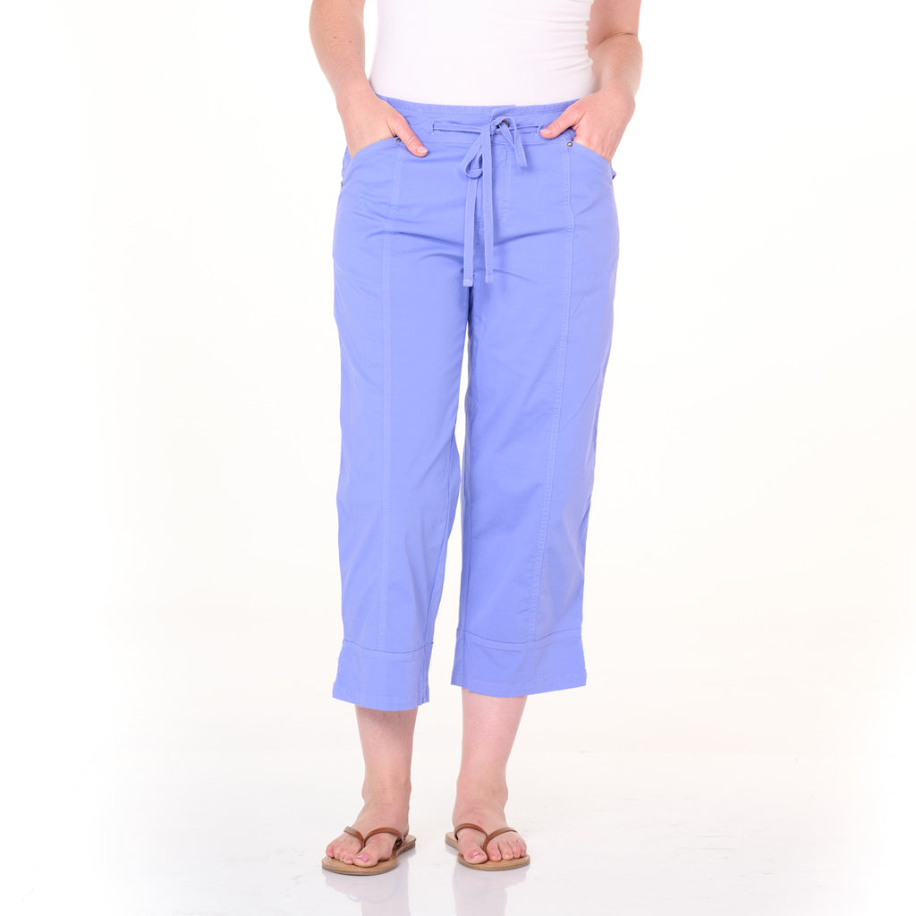 Enhance your wardrobe with the endless versatility of the Safari Capri.  Designed to be functional and comfortable with our stretch broadcloth fabric, perfect for all body shapes.  The relaxed fit has a comfy flat band on waist, functional pockets and hits at a flattering cropped length.  Featuring a zip fly with brass button closure, drawstring, front and back patch pockets.   Preshrunk. Machine wash cold, tumble dry low. 97% cotton, 3% spandex. Inseam 22 1/4" Length.  Finished in the USA from imported materials. Model is 5'8" and wears a size small.