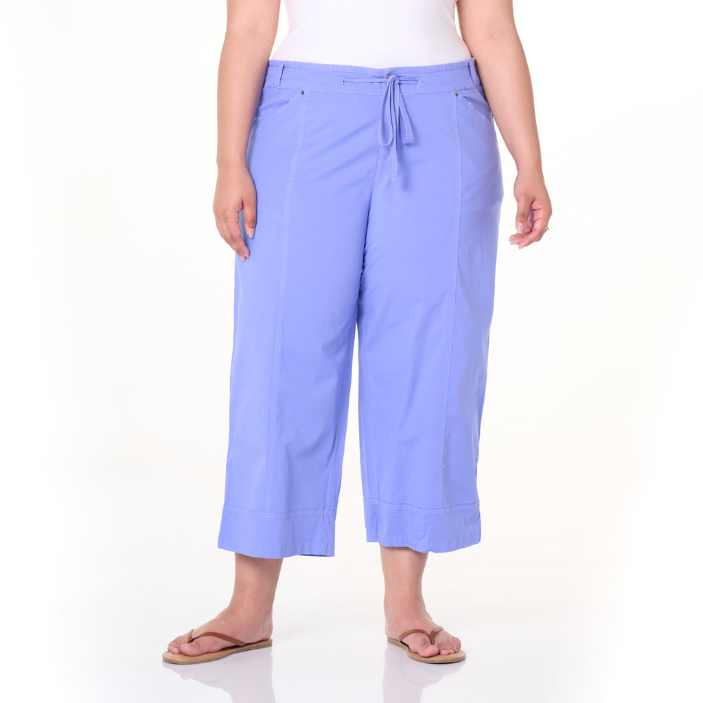Enhance your wardrobe with the endless versatility of the Safari Capri.  Designed to be functional and comfortable with our stretch broadcloth fabric, perfect for all body shapes.  The relaxed fit has a comfy flat band on waist, functional pockets and hits at a flattering cropped length.  Featuring a zip fly with brass button closure, drawstring, front and back patch pockets.   Preshrunk. Machine wash cold, tumble dry low. 97% cotton, 3% spandex. Inseam 22 1/4" Length.  Finished in the USA from imported materials. Model is 5'8" and wears a size 1X.