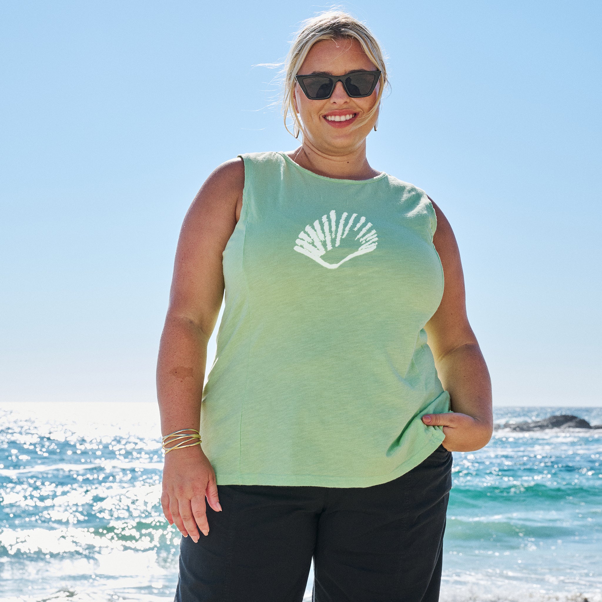 The nautical white sea shell makes a bold statement on the Chloe Tank. This wardrobe essential has a flattering princess seams and is great for layering. A surprise keyhole in the back adds a playful detail when you're wearing the tank on its own. Length 27 3/4" in size 1X. Preshrunk. Machine wash cold, tumble dry low. 100% mid-weight cotton slub. Made in the USA. Model is 5'8" and wears a size 1X.