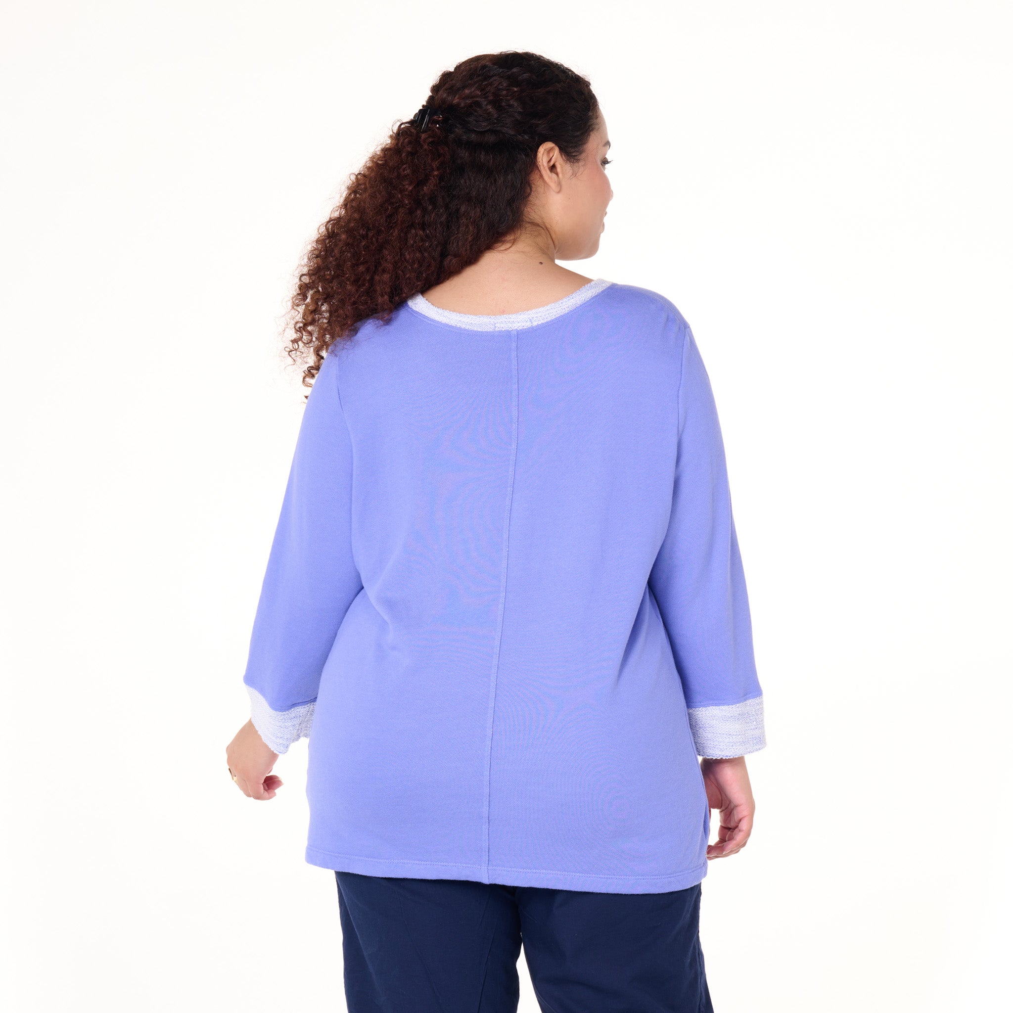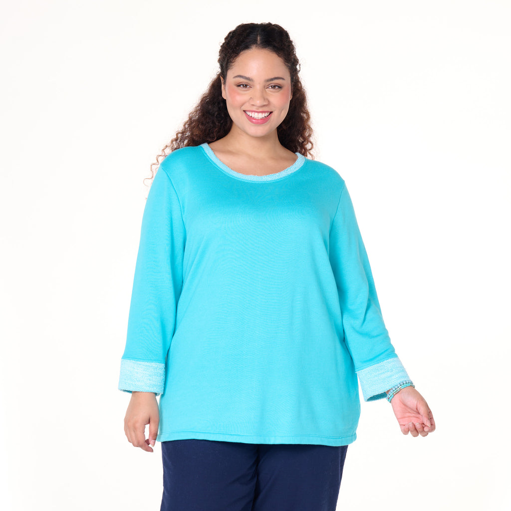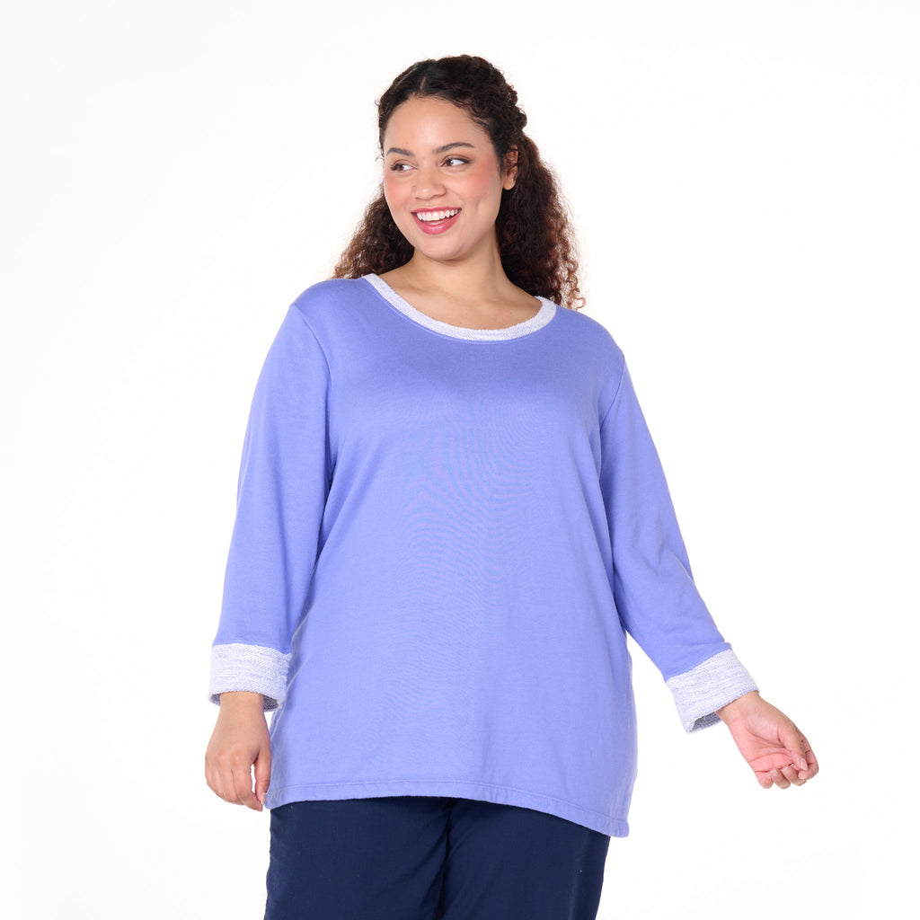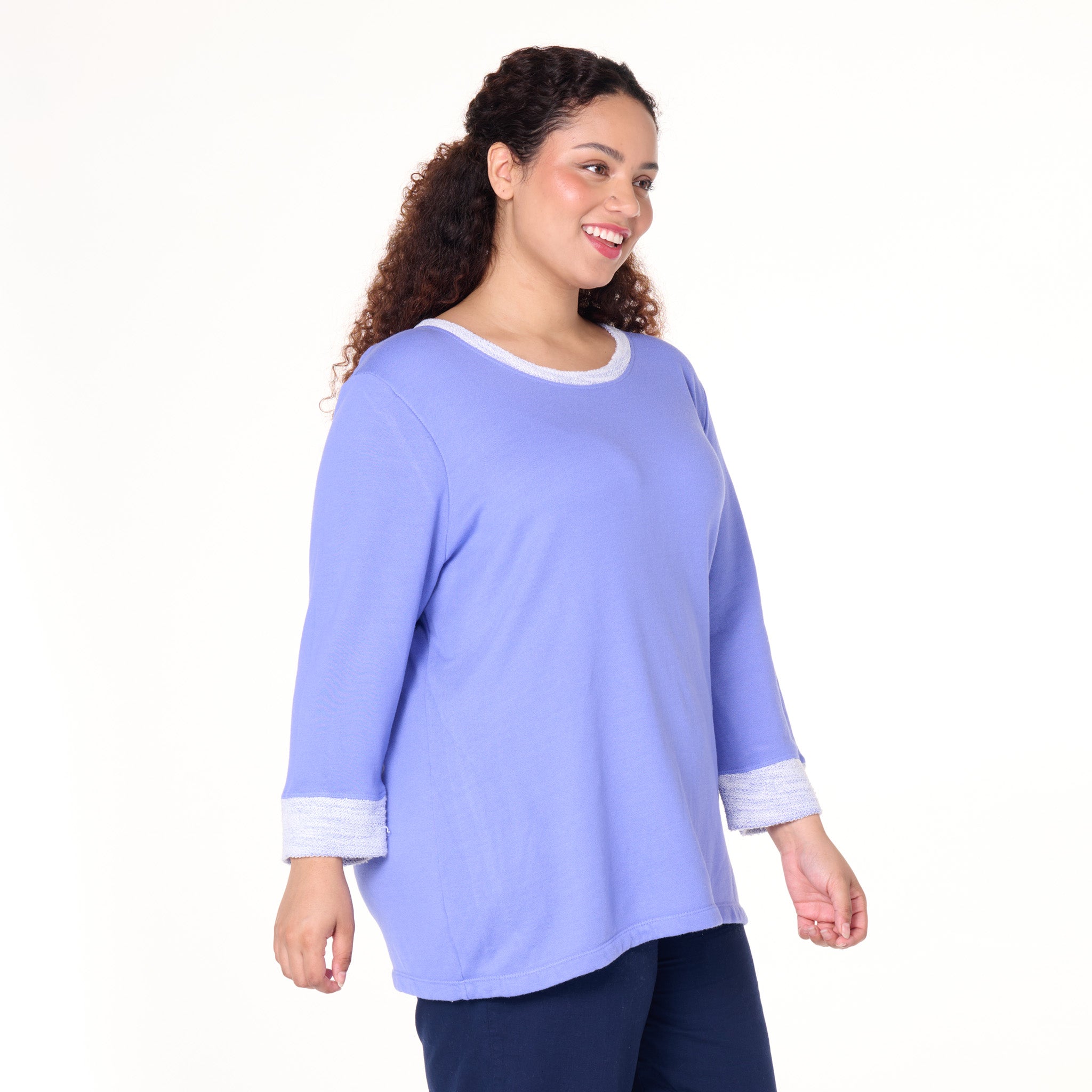 Add this cozy Sunset Sweatshirt to your wardrobe collection. The relaxed fit, soft loop french terry cotton, is also featured on the collar and cuff, which gives this a playful look. The style has a Scoop neckline, 3/4 sleeve, white loop cuff and neckline except for Cosmos that dyes to the garment color. Length 28 1/2 in size 1X. Preshrunk. Machine wash cold, tumble dry low. 42% polyester-30% modal-28% cotton. Made in the USA. Model is 5'8" and wears a size 1X.