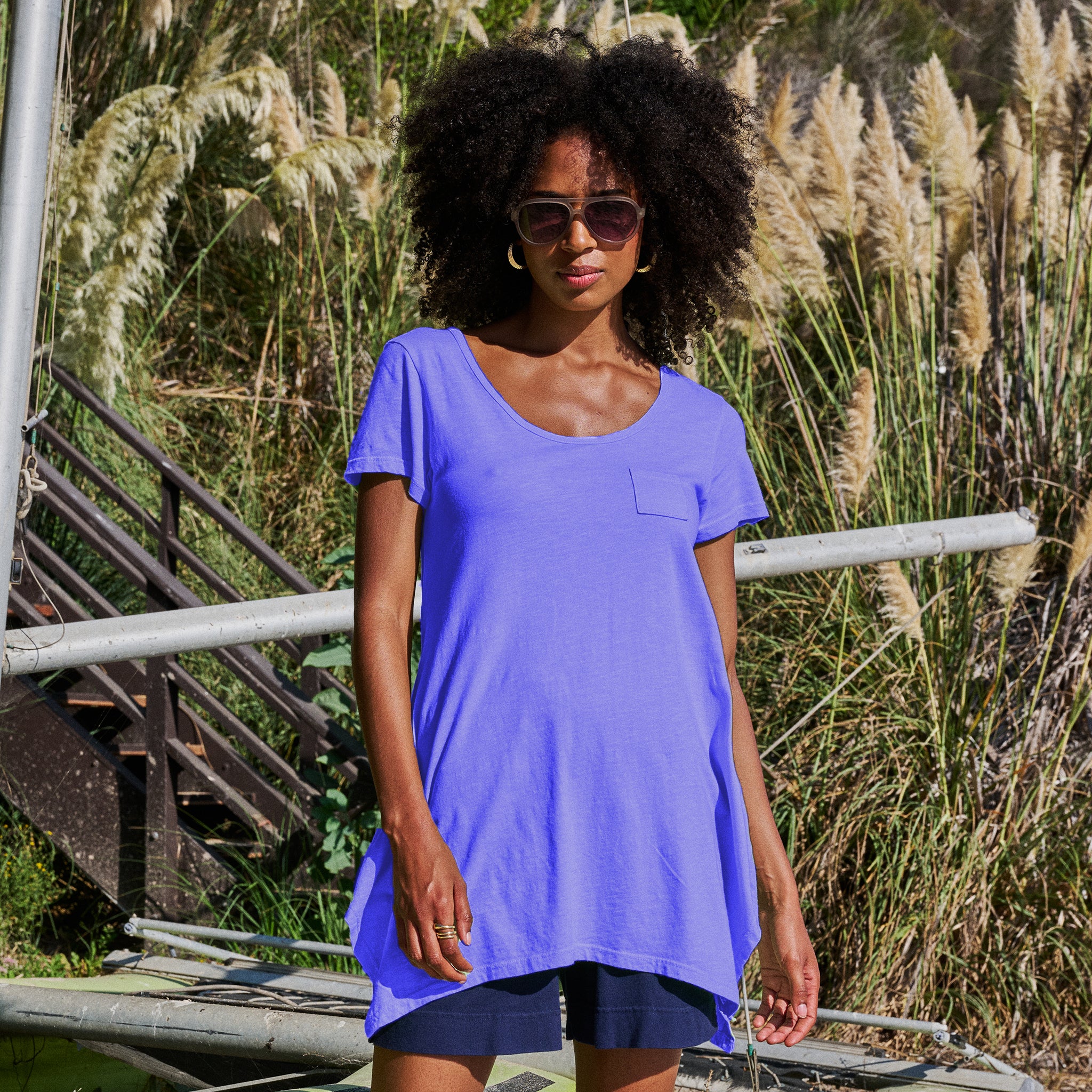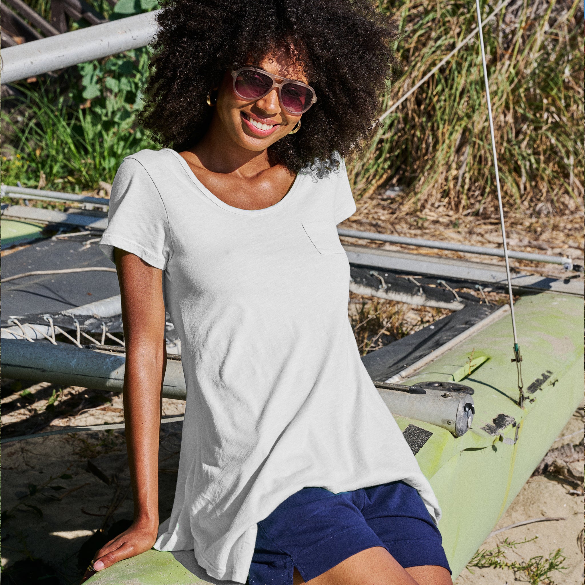 A fun new take on a classic scoop neck T, the Vintage Drape T features a pointed hemline, in a tunic length, tiny pocket detail on left chest.  This is a perfect style to wear as a cover-up or with your favorite bottoms.  Length 32"in size MD. Preshrunk. Machine wash cold, tumble dry low. 100% lightweight cotton slub jersey. Made in the USA. Model is 5'8" and wears a size small.