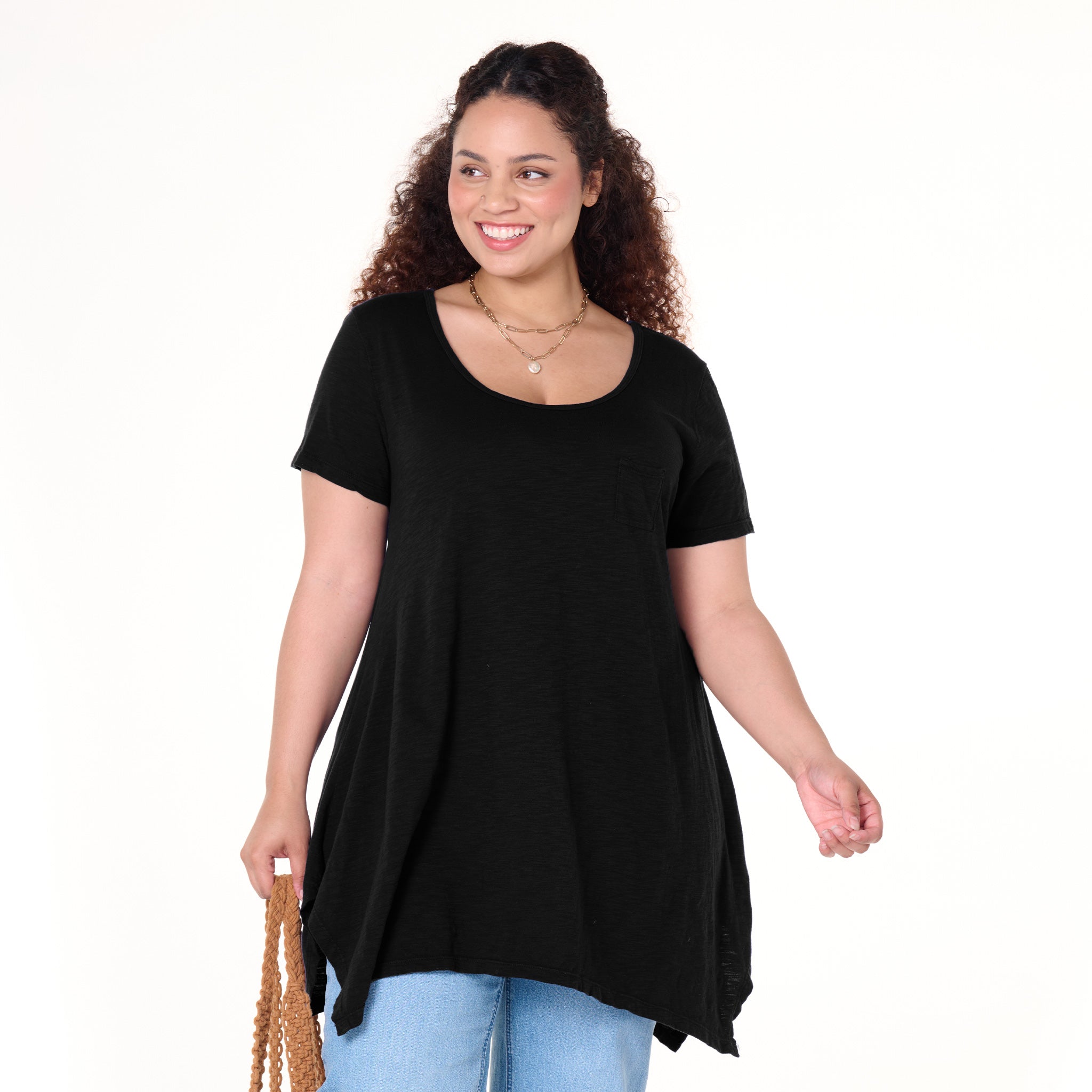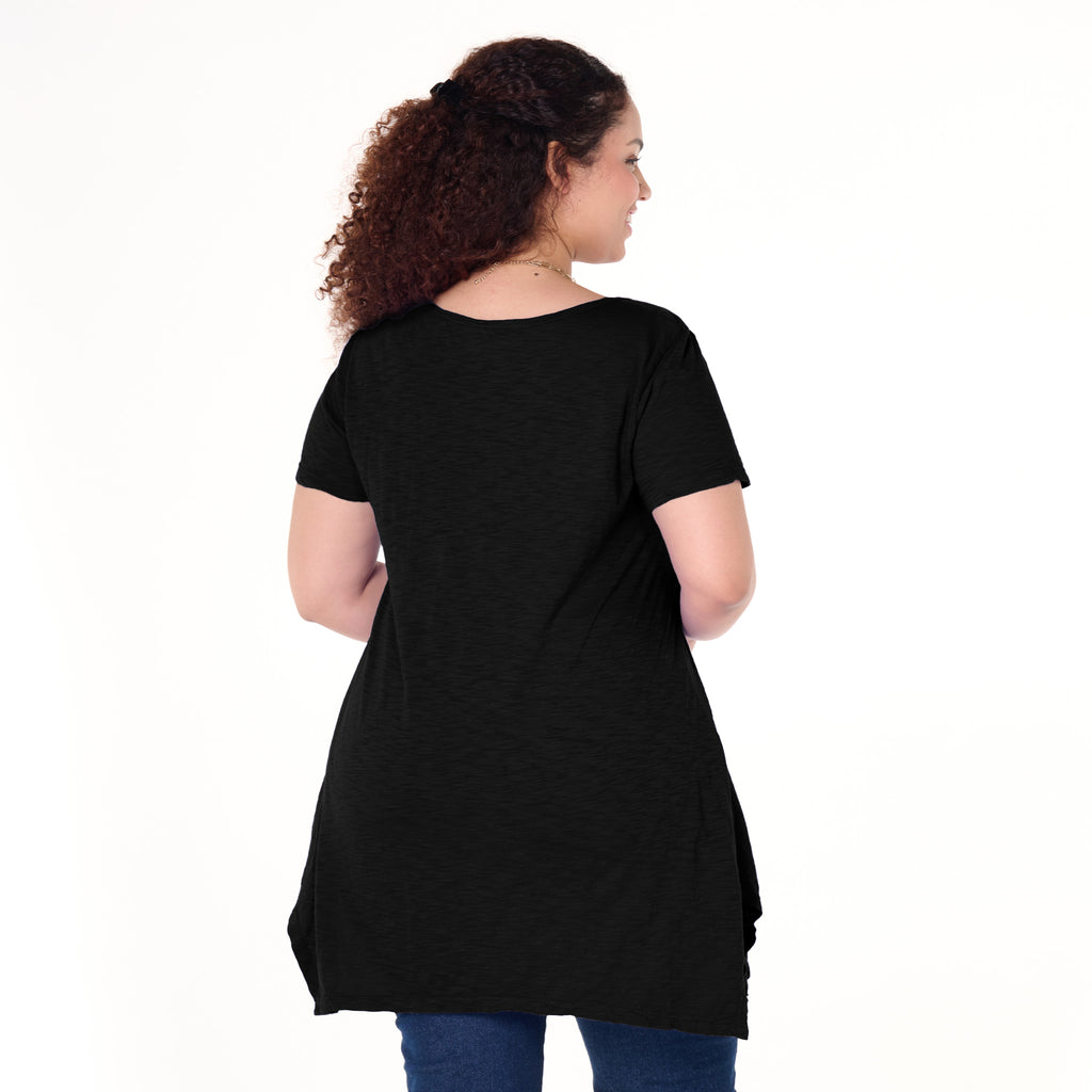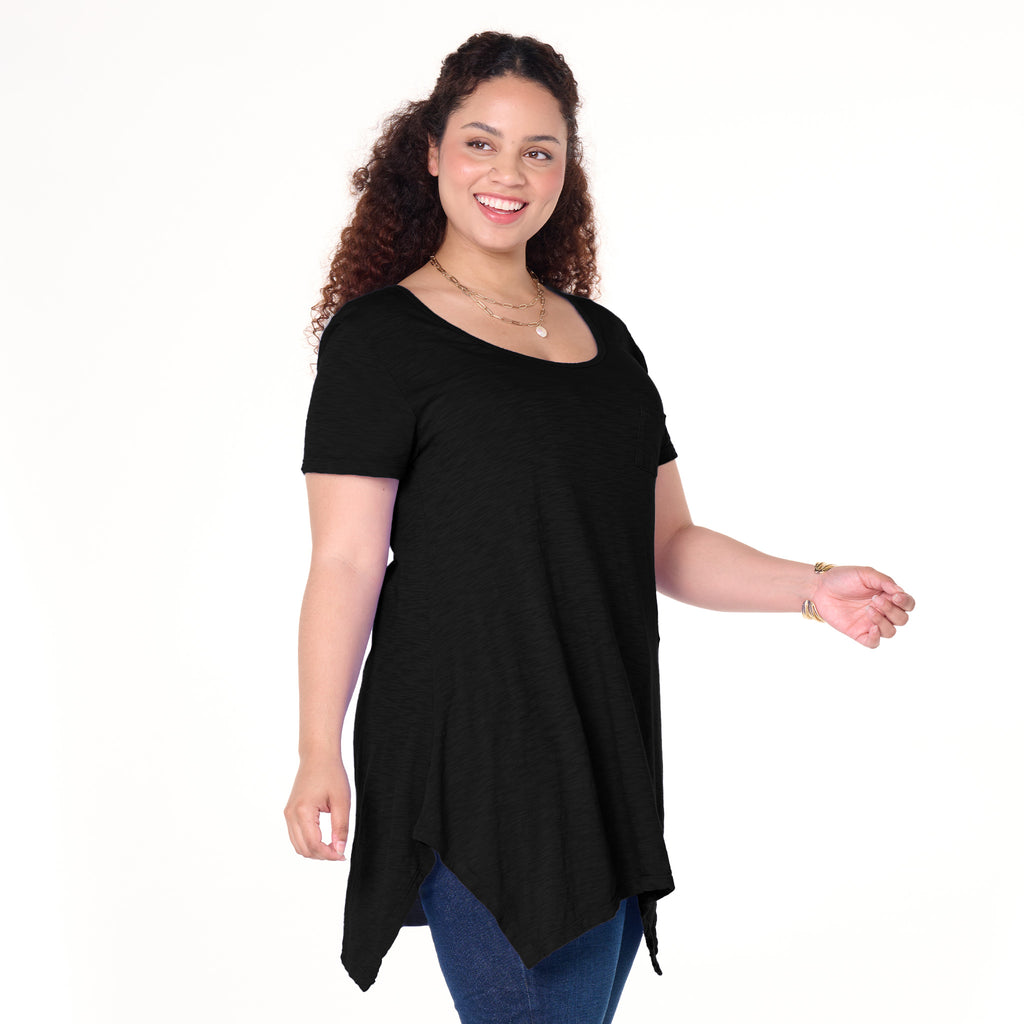 A fun new take on a classic scoop neck T, the Vintage Drape T features a pointed hemline, in a tunic length, tiny pocket detail on left chest. This is a perfect style to wear as a cover-up or with your favorite bottoms. Length 33 3/4"in size 1X. Machine wash cold, tumble dry low. 100% light weight cotton slub jersey. Preshrunk. Made in the USA. Model is 5'8" and wears a size 1X.